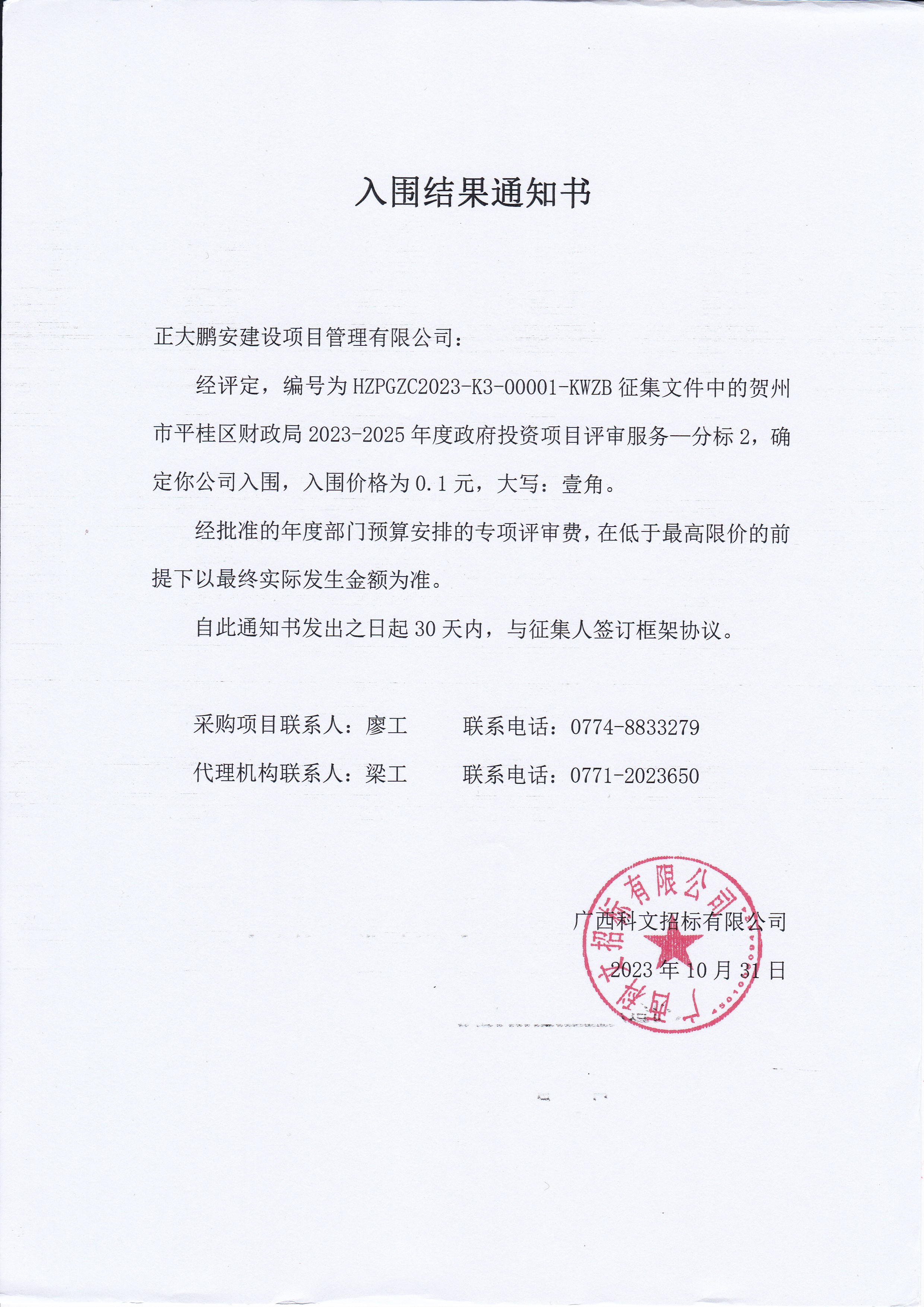 正大鵬安中標(biāo)賀州市平桂區(qū)財(cái)政局2023-2025年度政府投資項(xiàng)目評(píng)審服務(wù)一分標(biāo)2