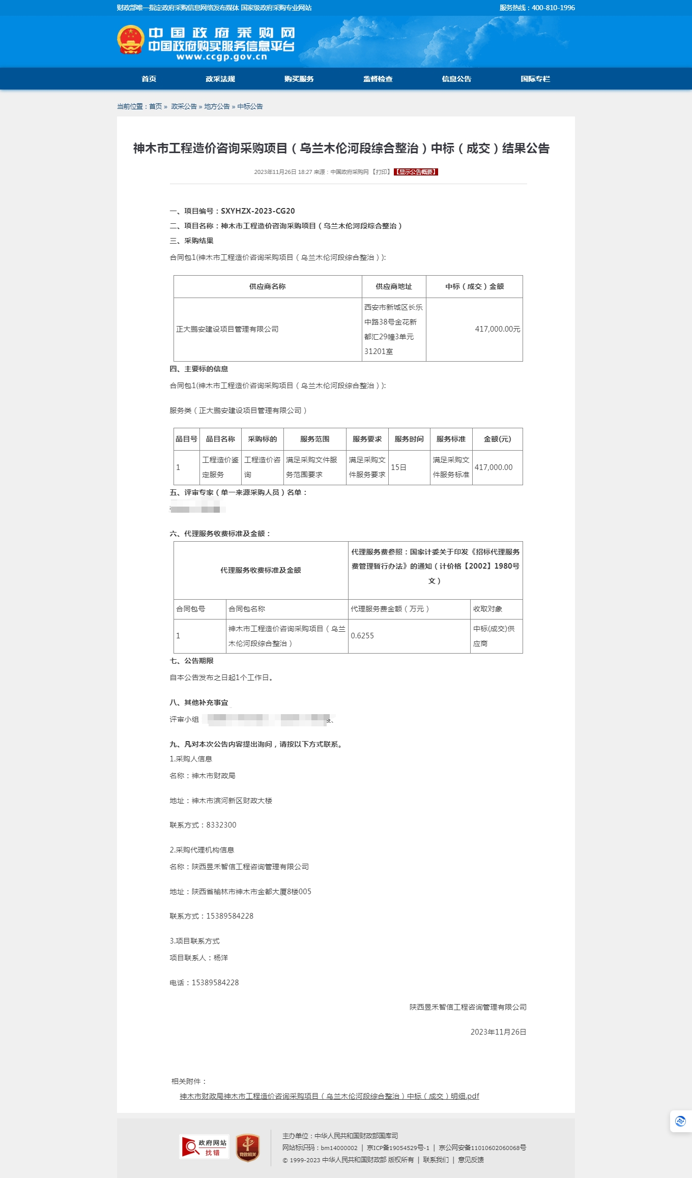 2023年11月,經(jīng)評(píng)標(biāo)委員會(huì)評(píng)定,招標(biāo)人確認(rèn),正大鵬安建設(shè)項(xiàng)目管理有限公司中標(biāo)“神木市工程造價(jià)咨詢采購項(xiàng)目(烏蘭木倫河段綜合整治)”。