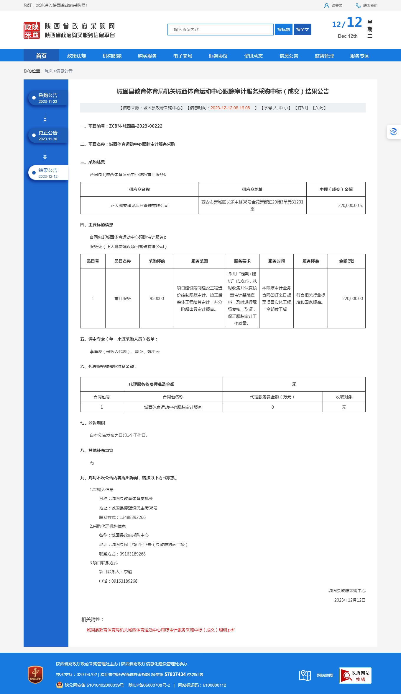 2023年12月,經(jīng)評標委員會綜合評審,招標人確認,正大鵬安建設項目管理有限公司中標“城固縣教育體育局城西體育運動中心跟蹤審計服務項目”。