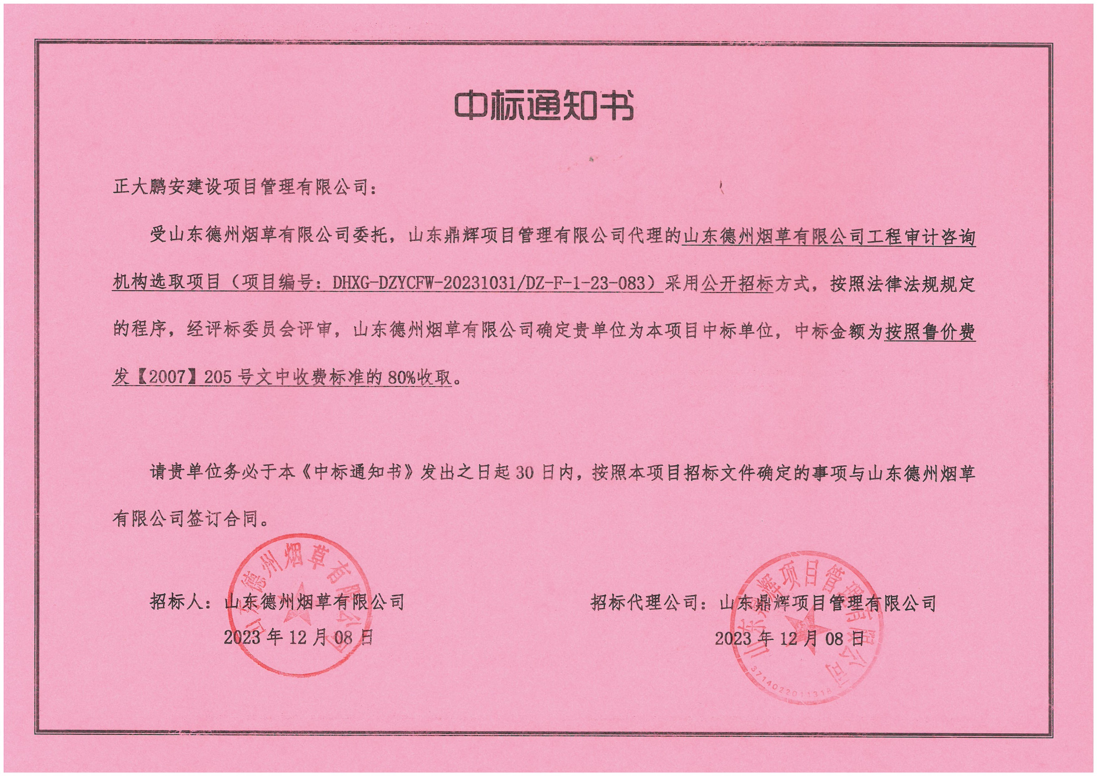 正大鵬安中標山東德州煙草有限公司工程審計咨詢機構(gòu)選取項目