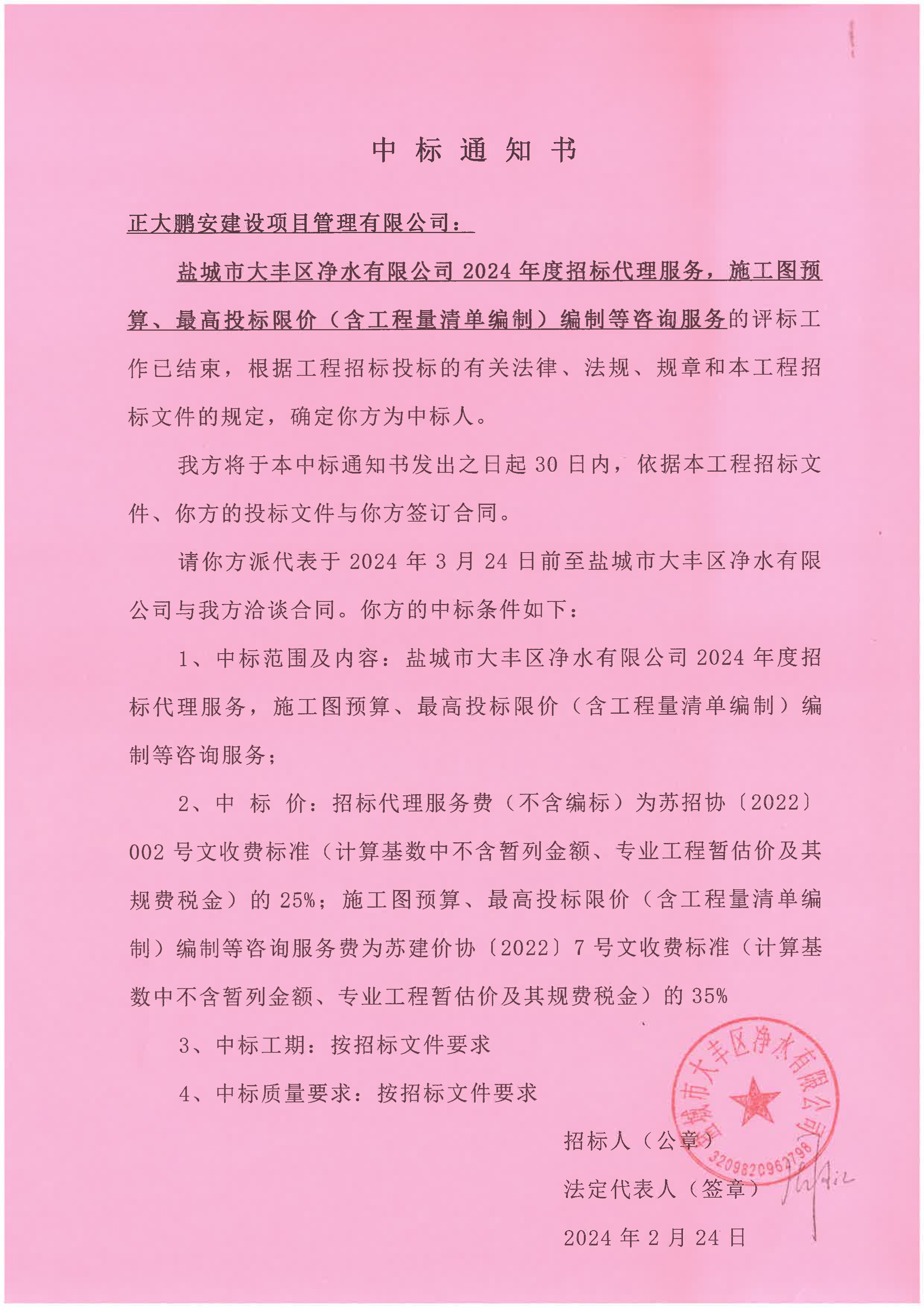 正大鵬安中標(biāo)鹽城市大豐區(qū)凈水有限公司2024年度招標(biāo)代理服務(wù),施工圖預(yù)算、最高投標(biāo)限價(含工程量清單編制)編制等咨詢服務(wù)項(xiàng)目