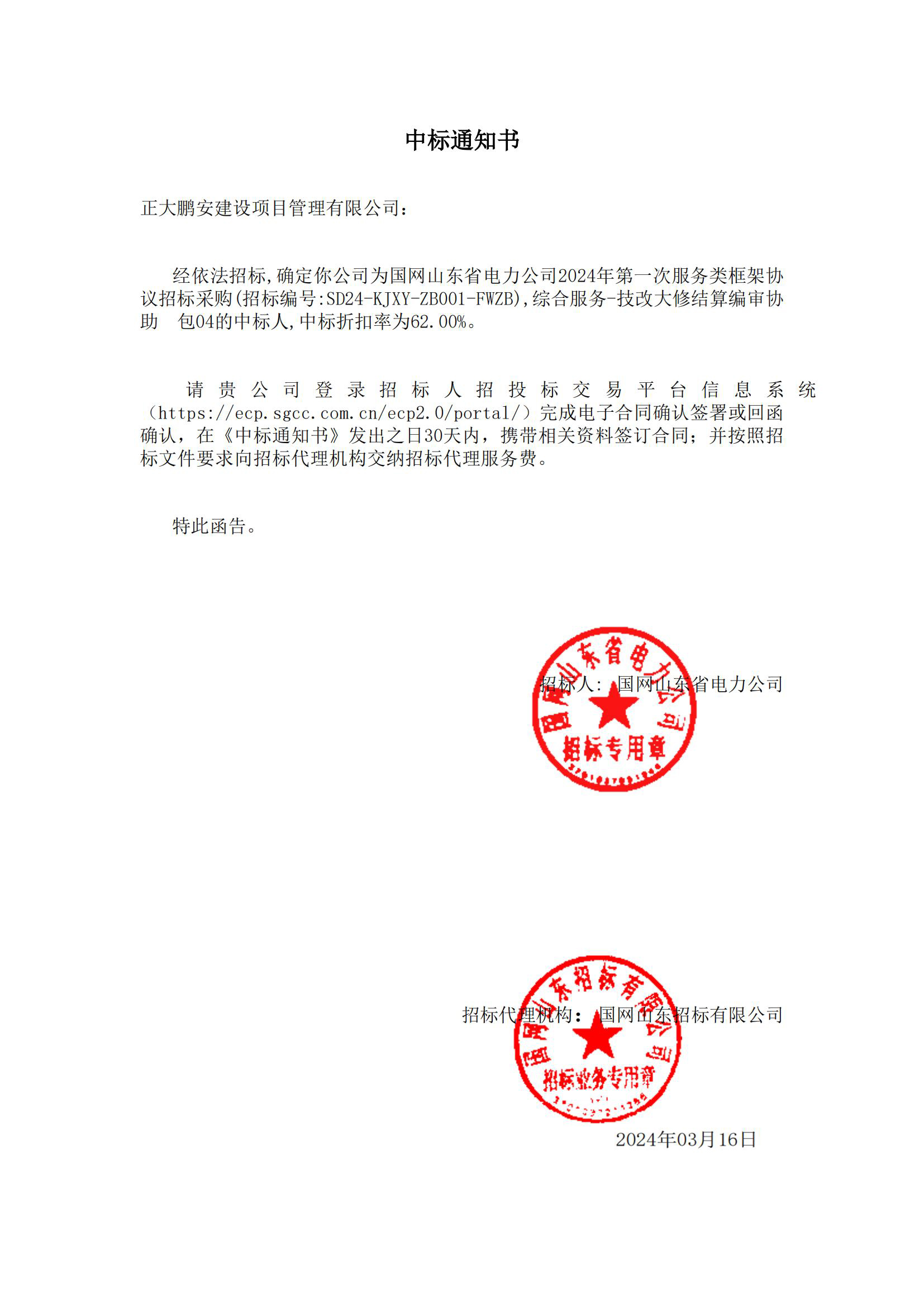 正大鵬安中標(biāo)國(guó)網(wǎng)山東省電力公司2024年第一次服務(wù)類框架協(xié)議招標(biāo)采購(gòu)項(xiàng)目