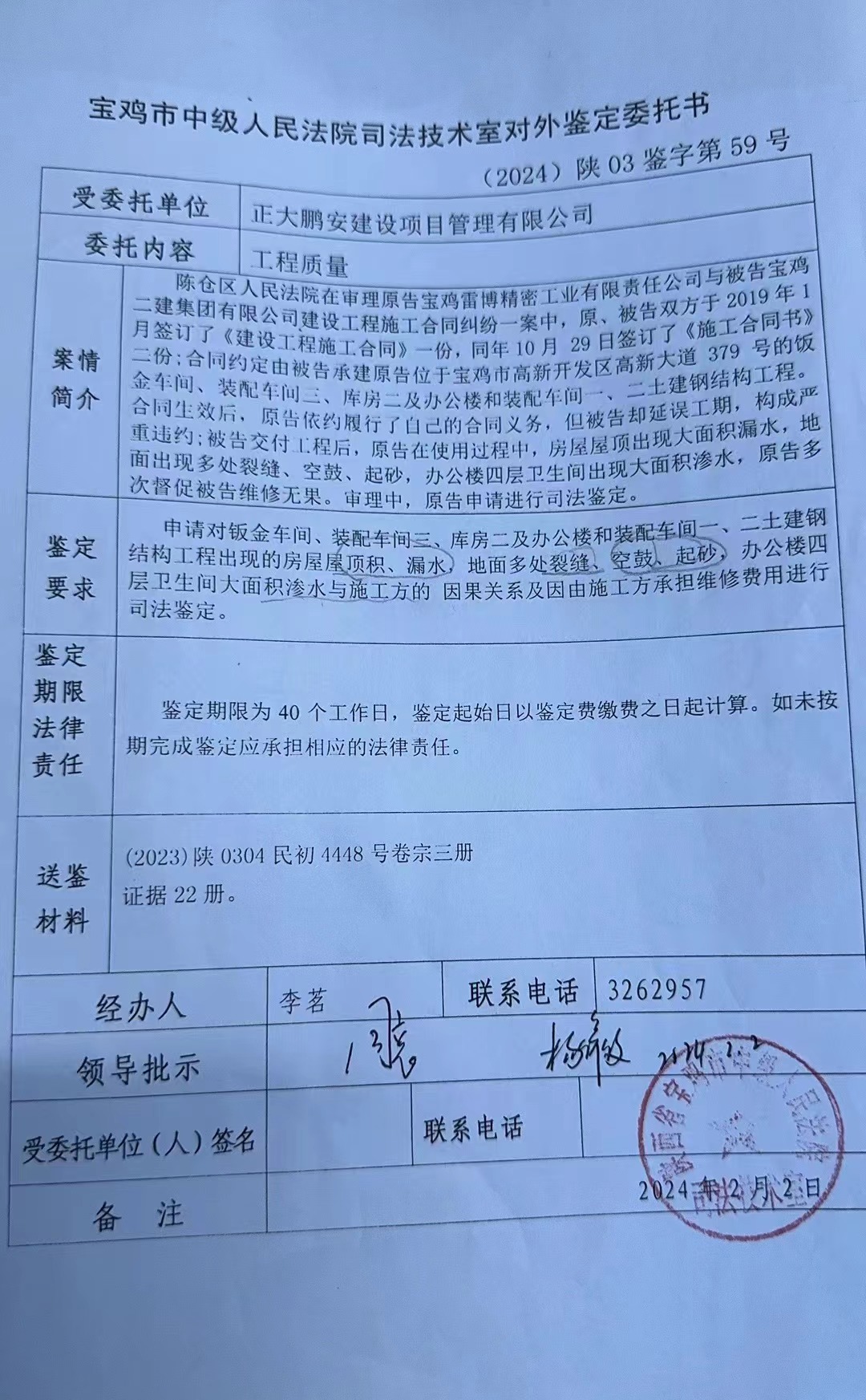工程名稱:原告寶雞雷博精密工業(yè)有限責(zé)任公司與被告寶雞二建集團(tuán)有限公司建設(shè)工程合同糾紛一案