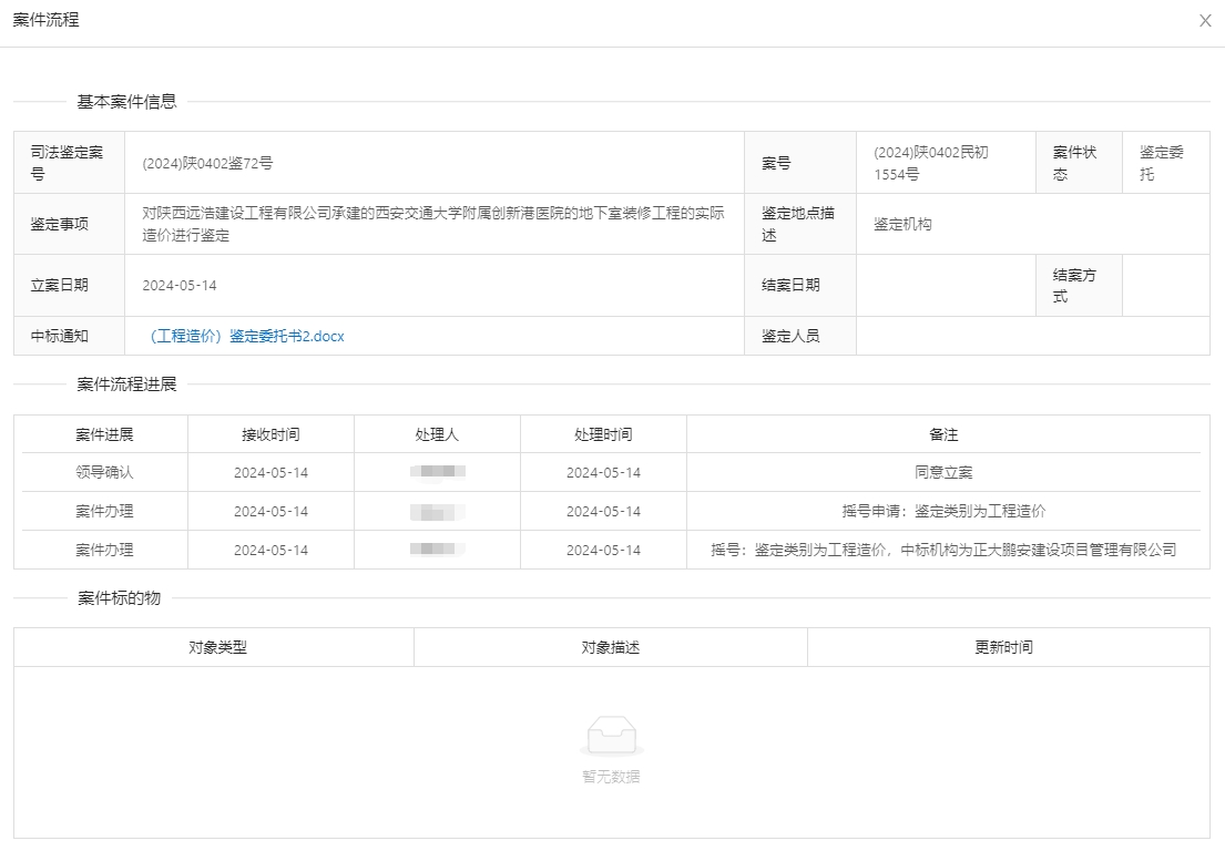 2024年5月14日,經(jīng)咸陽(yáng)市秦都區(qū)人民法院確認(rèn),正大鵬安建設(shè)項(xiàng)目管理有限公司中標(biāo)“原告陜西遠(yuǎn)浩建設(shè)工程有限公司與被告西安創(chuàng)新港醫(yī)院管理有限公司、陜西建工第五建設(shè)集團(tuán)有限公司、陜西盛超建筑工程有限公司合同糾紛一案”造價(jià)司法鑒定項(xiàng)目。
