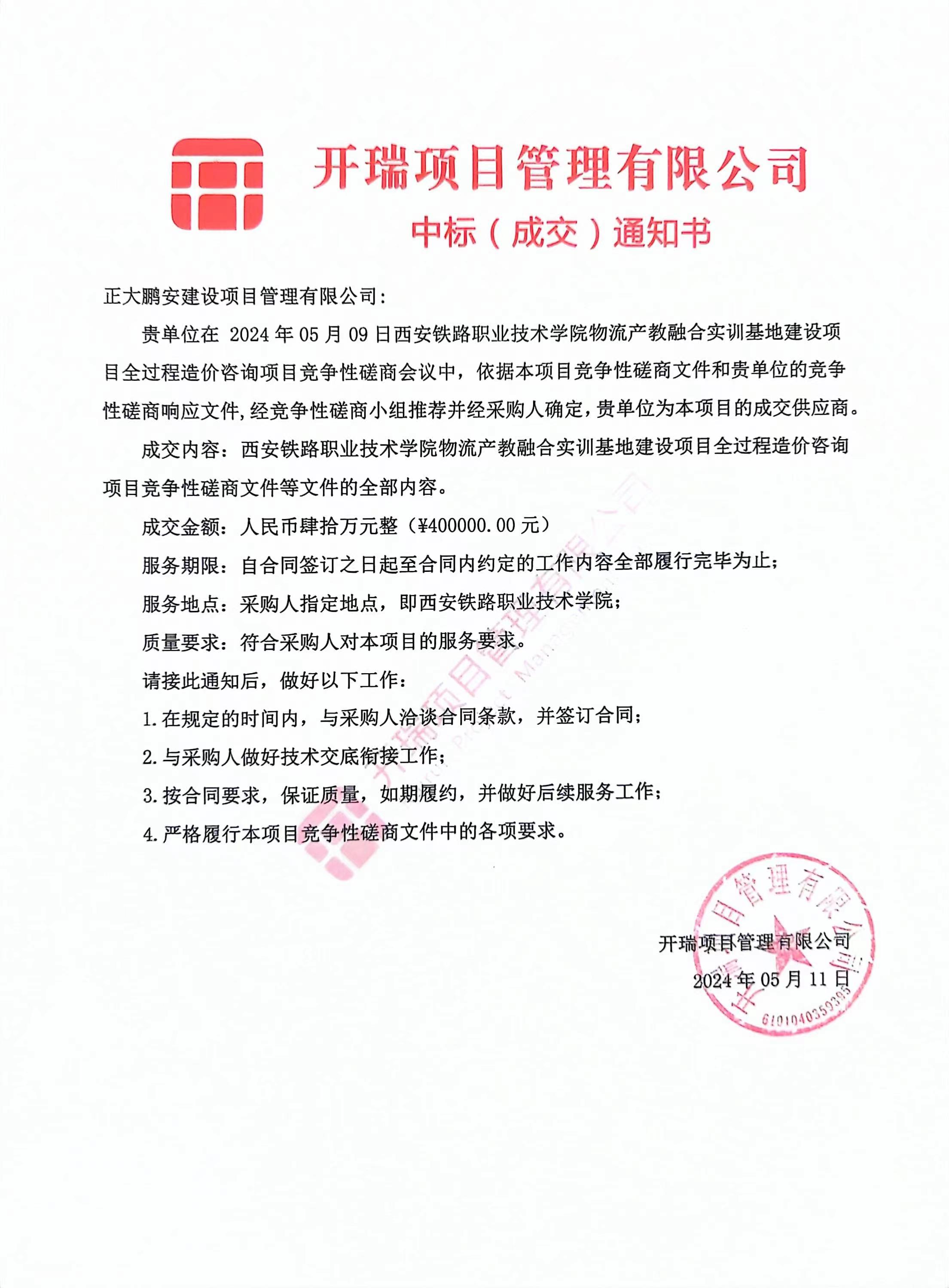 2024年5月9日,經(jīng)評(píng)標(biāo)委員會(huì)綜合評(píng)審,招標(biāo)人確認(rèn),正大鵬安建設(shè)項(xiàng)目管理有限公司中標(biāo)“西安鐵路職業(yè)技術(shù)學(xué)院物流產(chǎn)教融合實(shí)訓(xùn)基地建設(shè)項(xiàng)目全過程造價(jià)咨詢項(xiàng)目”。