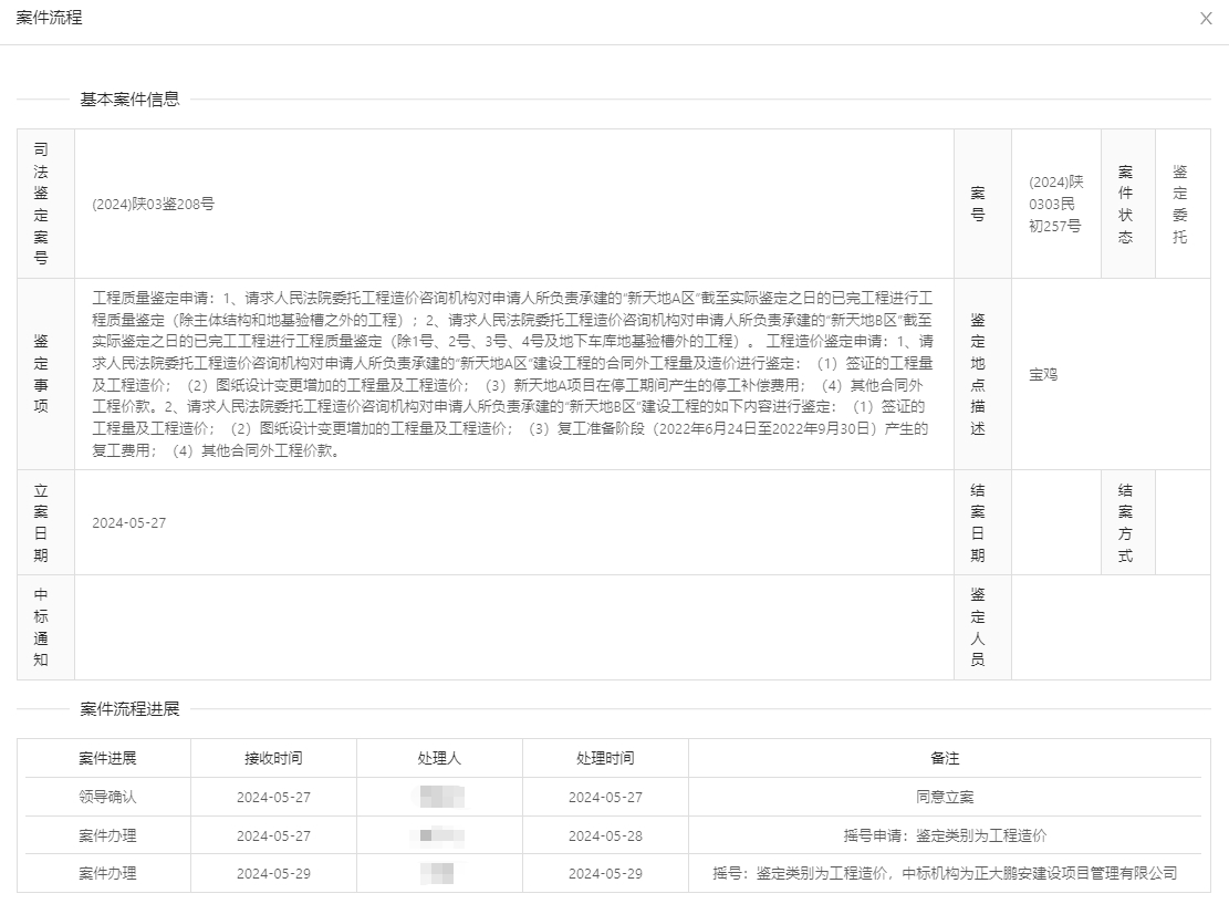 2024年5月27日,經(jīng)寶雞市中級人民法院確認,正大鵬安建設(shè)項目管理有限公司中標“原告中建三局集團有限公司與被告陜西東嶺房地產(chǎn)開發(fā)有限公司、東嶺集團股份有限公司建設(shè)工程施工合同糾紛一案”司法鑒定項目。