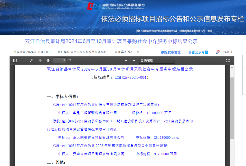 2024年6月13日,經(jīng)評標(biāo)委員會綜合評審,招標(biāo)人確認(rèn),正大鵬安建設(shè)項(xiàng)目管理有限公司中標(biāo)“雙江自治縣審計(jì)局2024年6月至10月審計(jì)項(xiàng)目采購社會中介服務(wù)”項(xiàng)目。