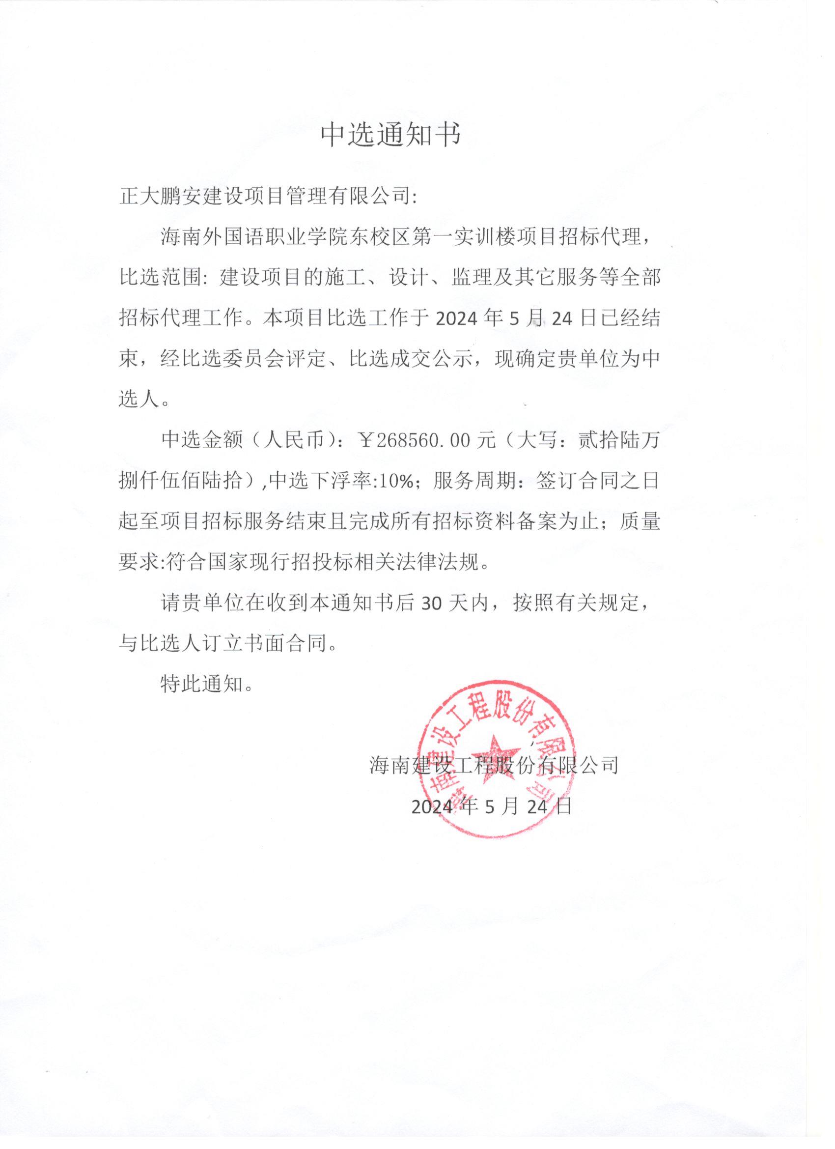 2024年5月24日,經(jīng)評(píng)標(biāo)委員會(huì)綜合評(píng)審,招標(biāo)人確認(rèn),正大鵬安建設(shè)項(xiàng)目管理有限公司中標(biāo)海南外國語職業(yè)學(xué)院東校區(qū)第一實(shí)訓(xùn)樓項(xiàng)目招標(biāo)代理