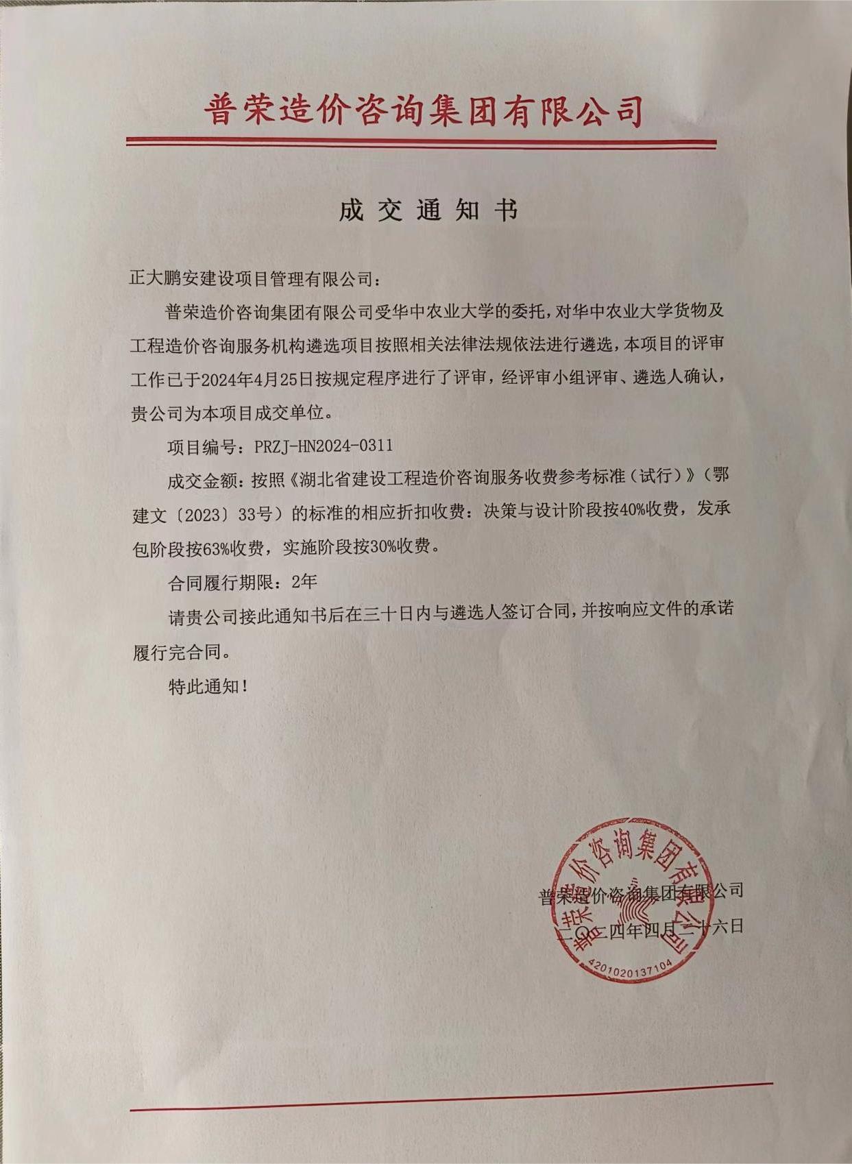 2024年4月25日,經評標委員會綜合評審,招標人確認,正大鵬安建設項目管理有限公司中標”華中農業(yè)大學貨物及工程造價咨詢服務機構遴選“項目”。