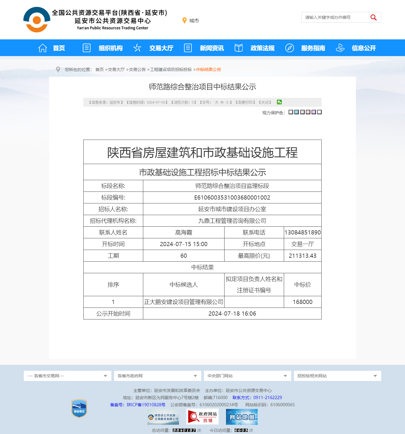 2024年7月15日,經(jīng)評標委員會綜合評審,招標人確認,正大鵬安建設(shè)項目管理有限公司中標師范路綜合整治項目監(jiān)理標段。
