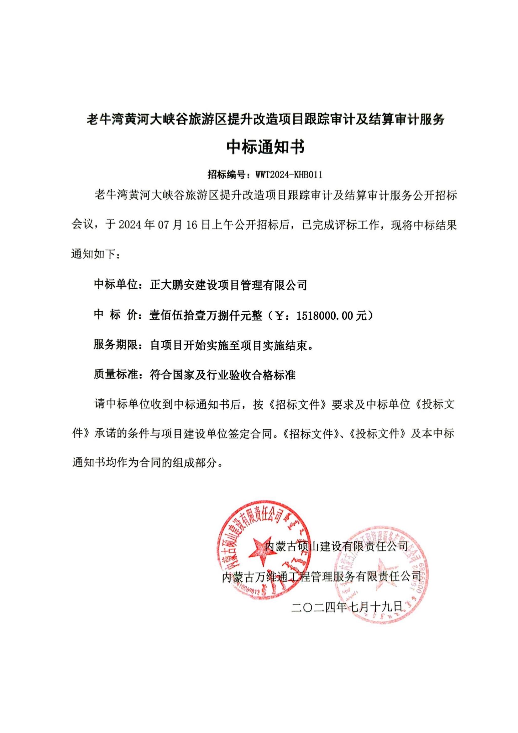 2024年7月16日,經(jīng)評標(biāo)委員會綜合評審,招標(biāo)人確認(rèn),正大鵬安建設(shè)項(xiàng)目管理有限公司中標(biāo)“老牛灣黃河大峽谷旅游區(qū)提升改造項(xiàng)目跟蹤審計(jì)及結(jié)算審計(jì)服務(wù)項(xiàng)目”。