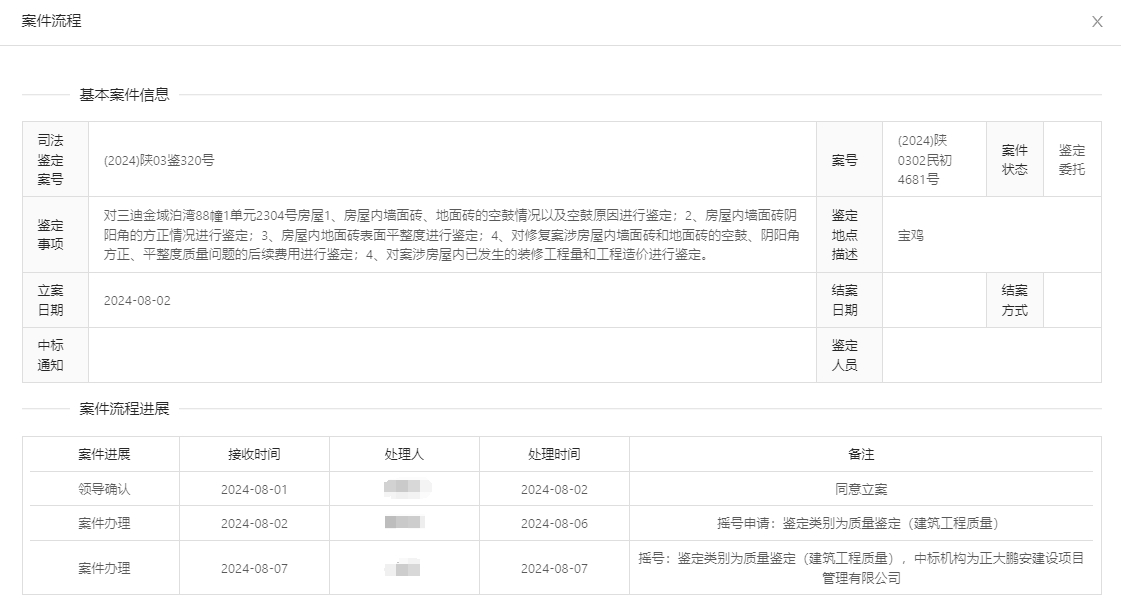2024年8月2日,經(jīng)寶雞市中級人民法院確認,正大鵬安建設(shè)項目管理有限公司中標“原告薛揚與被告寶雞城市人家裝飾有限公司裝修施工合同糾紛一案”質(zhì)量司法鑒定項目。