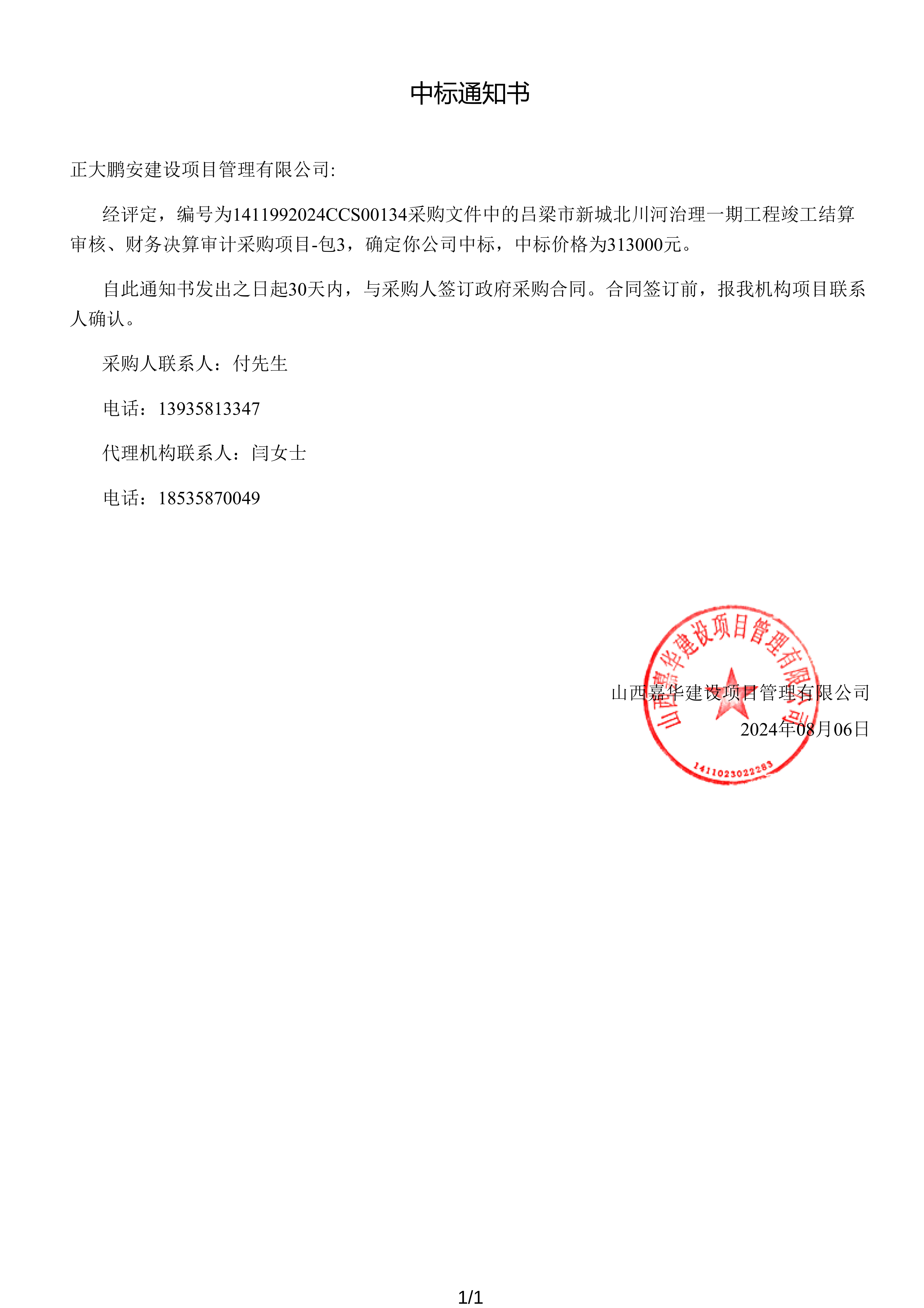 2024年8月2日,經(jīng)評標(biāo)委員會綜合評審,招標(biāo)人確認(rèn),正大鵬安建設(shè)項目管理有限公司中標(biāo)“呂梁市新城北川河治理一期工程竣工結(jié)算審核、財務(wù)決算審計采購項目”。