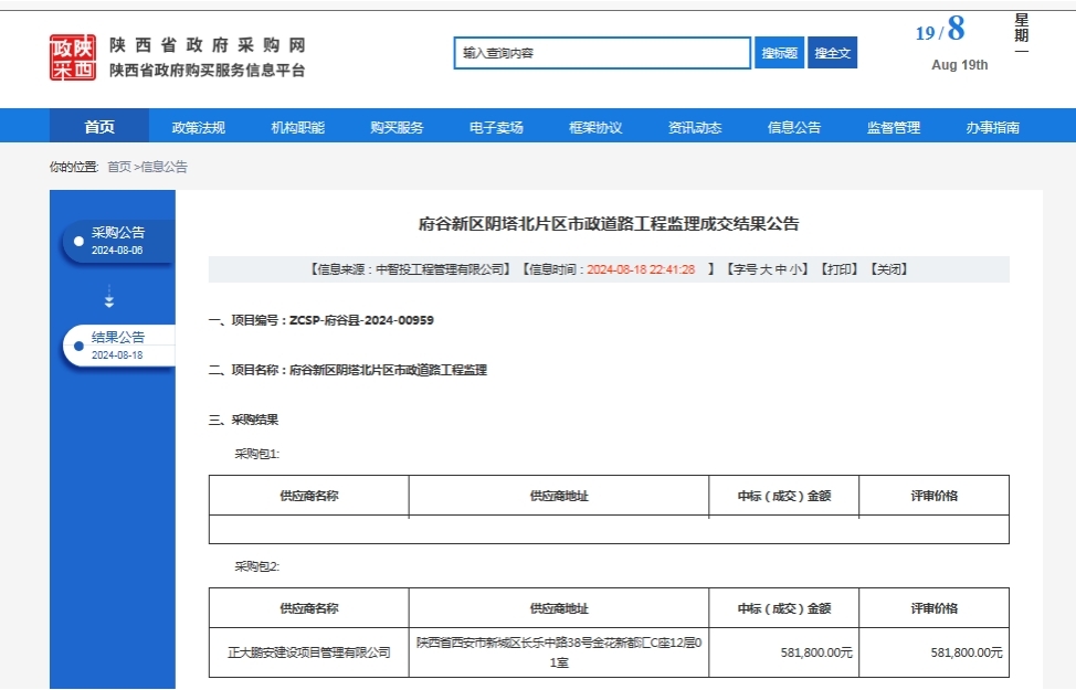 2024年8月19日,經(jīng)評標委員會綜合評審,招標人確認,正大鵬安建設項目管理有限公司中標府谷新區(qū)陰塔北片區(qū)市政道路工程監(jiān)理N2標段。