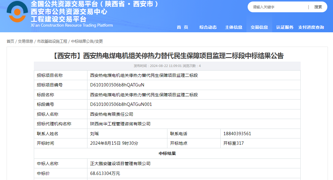 2024年8月22日,經(jīng)評(píng)標(biāo)委員會(huì)綜合評(píng)審,招標(biāo)人確認(rèn),正大鵬安建設(shè)項(xiàng)目管理有限公司中標(biāo)西安熱電煤電機(jī)組關(guān)停熱力替代民生保障項(xiàng)目監(jiān)理二標(biāo)段。