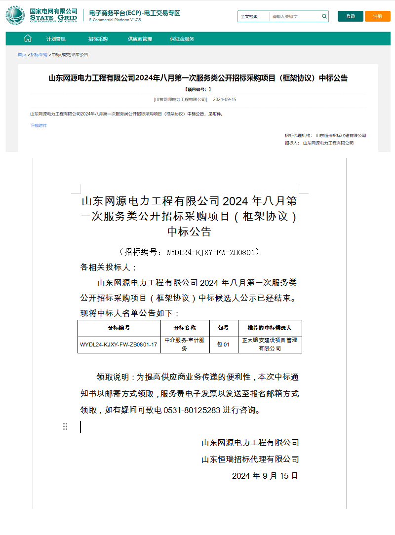 正大鵬安中標(biāo)山東網(wǎng)源電力工程有限公司2024年八月第一次服務(wù)類公開招標(biāo)采購項(xiàng)目(框架協(xié)議)