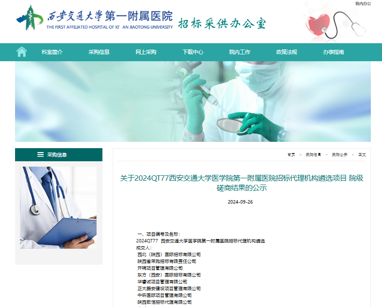 正大鵬安中標(biāo)西安交通大學(xué)醫(yī)學(xué)院第一附屬醫(yī)院招標(biāo)代理機(jī)構(gòu)遴選項(xiàng)目