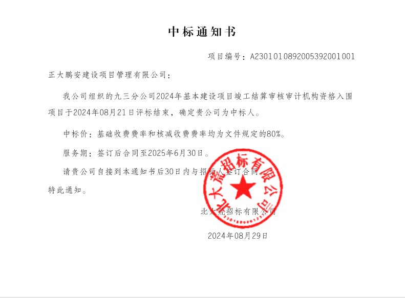 2024年8月29日,經(jīng)評標(biāo)委員會綜合評審,招標(biāo)人確認(rèn),正大鵬安建設(shè)項(xiàng)目管理有限公司入圍"北大荒農(nóng)墾集團(tuán)九三分公司2024年基本建設(shè)項(xiàng)目審計(jì)機(jī)構(gòu)資格入圍項(xiàng)目”。