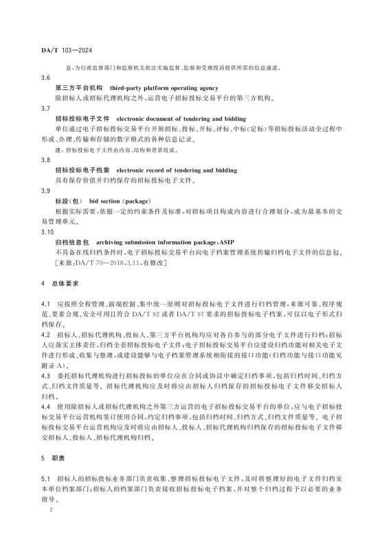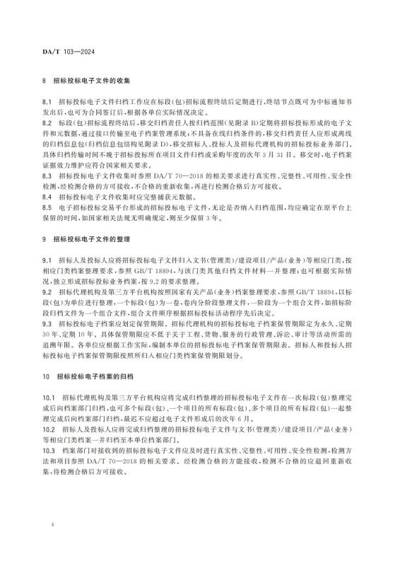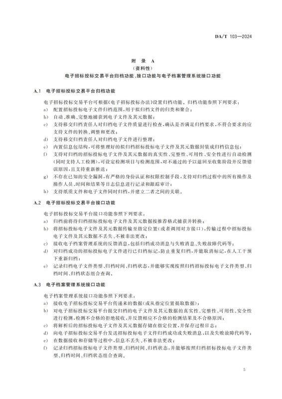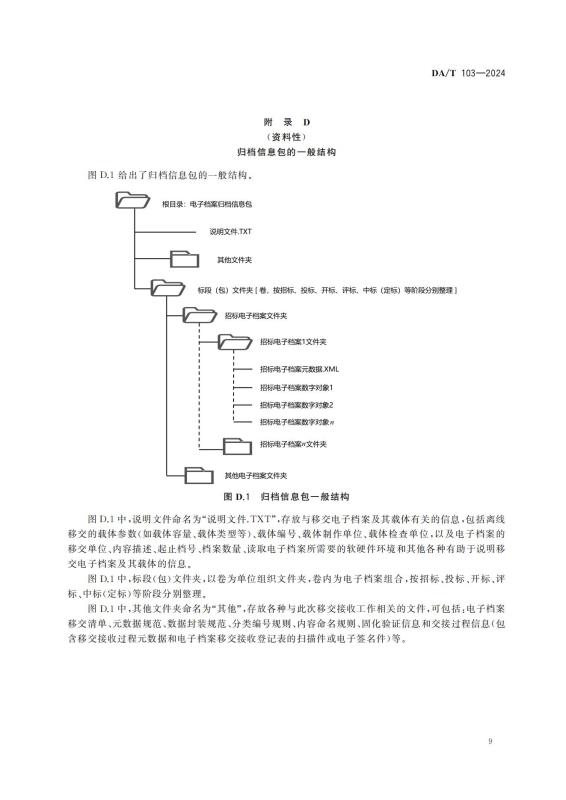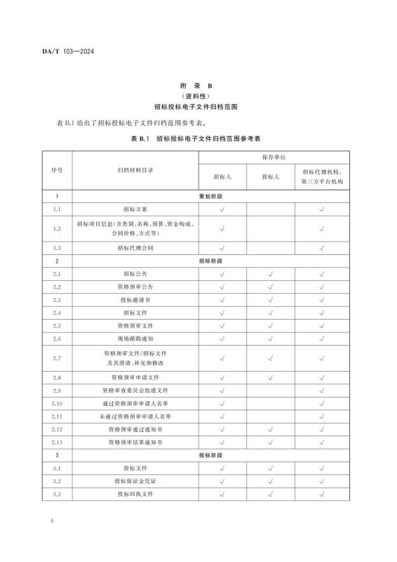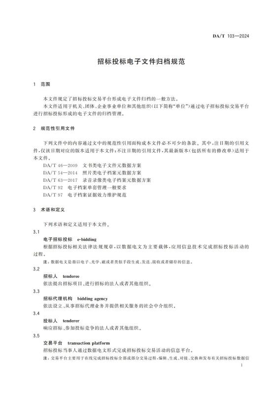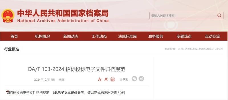 近日,國(guó)家檔案局發(fā)布《招標(biāo)投標(biāo)電子文件歸檔規(guī)范》行業(yè)標(biāo)準(zhǔn)?!墩袠?biāo)投標(biāo)電子文件歸檔規(guī)范》規(guī)定了招標(biāo)投標(biāo)交易平臺(tái)形成電子文件歸檔的一般方法,涵蓋了招標(biāo)投標(biāo)電子文件歸檔范圍以及招標(biāo)投標(biāo)電子文件的形成、收集、整理、歸檔、系統(tǒng)功能接口等多方面的指標(biāo)和要求,為推行招標(biāo)投標(biāo)電子檔案“單套制”管理提供了一種技術(shù)方案。標(biāo)準(zhǔn)將于2025年2月1日起實(shí)施。