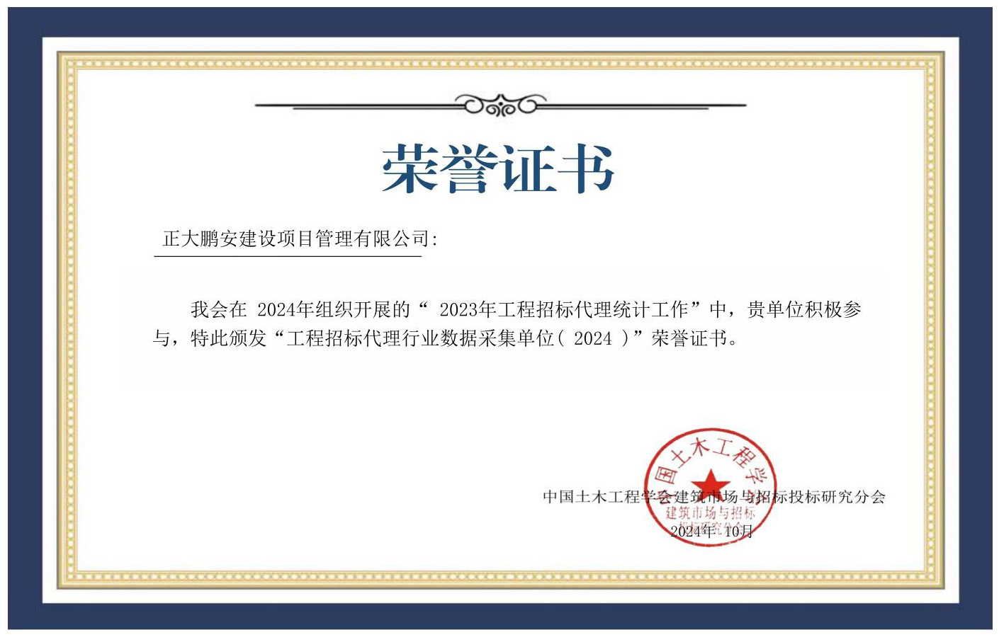 近日,在中國土木工程學(xué)會建筑市場與招標(biāo)投標(biāo)研究分會組織開展的“工程招標(biāo)代理統(tǒng)計工作”中,正大鵬安公司榮獲“工程招標(biāo)代理行業(yè)數(shù)據(jù)采集單位(2024)”榮譽證書。