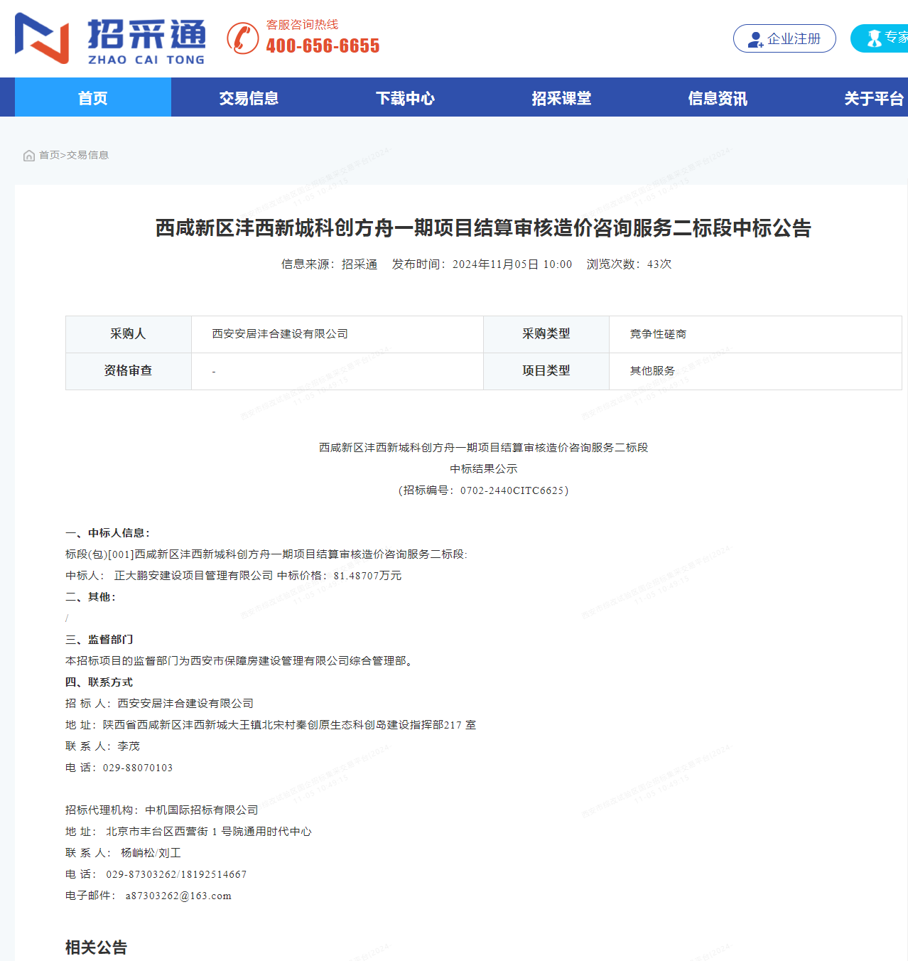 2024年11月5日,經(jīng)評(píng)標(biāo)委員會(huì)綜合評(píng)審,招標(biāo)人確認(rèn),正大鵬安建設(shè)項(xiàng)目管理有限公司中標(biāo)西咸新區(qū)灃西新城科創(chuàng)方舟一期項(xiàng)目結(jié)算審核造價(jià)咨詢服務(wù)二標(biāo)段。