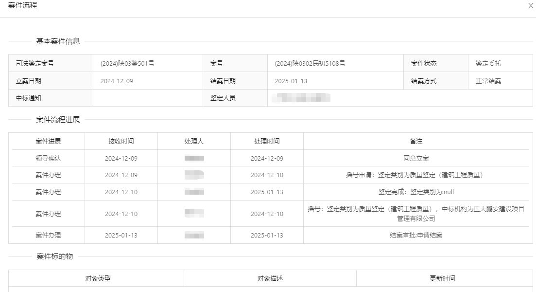 2024年11月26日,經(jīng)寶雞市中級(jí)人民法院確認(rèn),正大鵬安建設(shè)項(xiàng)目管理有限公司中標(biāo)“原告蔡明與被告王麗莉、寶雞市世邦物業(yè)管理有限公司、白浪關(guān)于房屋漏水原因”質(zhì)量司法鑒定項(xiàng)目。
