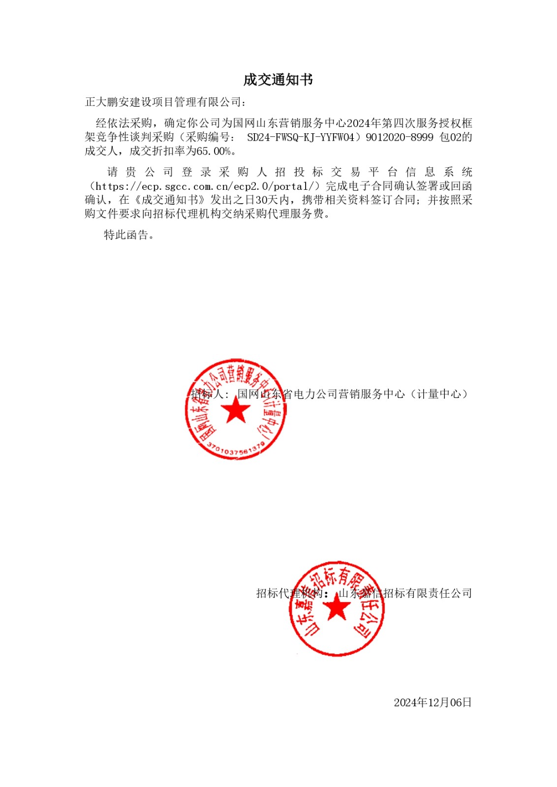 2024年12月6日,經評標委員會綜合評審,招標人確認,正大鵬安建設項目管理有限公司中標“國網山東營銷服務中心2024年第四次服務授權框架競爭性談判采購項目(采購編號: SD24-FWSQ-KJ-YYFW04)9012020-8999 包02”。