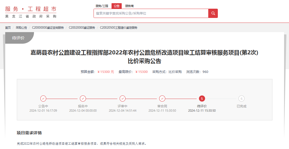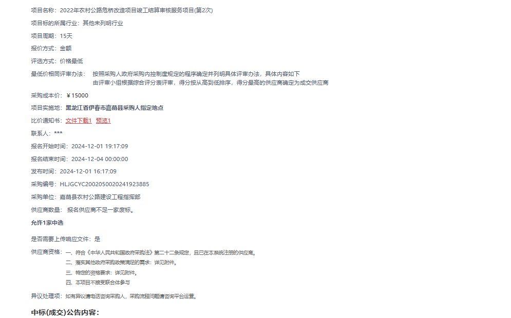 2024年12月11日,經(jīng)評(píng)標(biāo)委員會(huì)綜合評(píng)審,招標(biāo)人確認(rèn),正大鵬安建設(shè)項(xiàng)目管理有限公司中標(biāo)嘉蔭縣農(nóng)村公路建設(shè)工程指揮部2022年農(nóng)村公路危橋改造項(xiàng)目竣工結(jié)算審核服務(wù)項(xiàng)目。