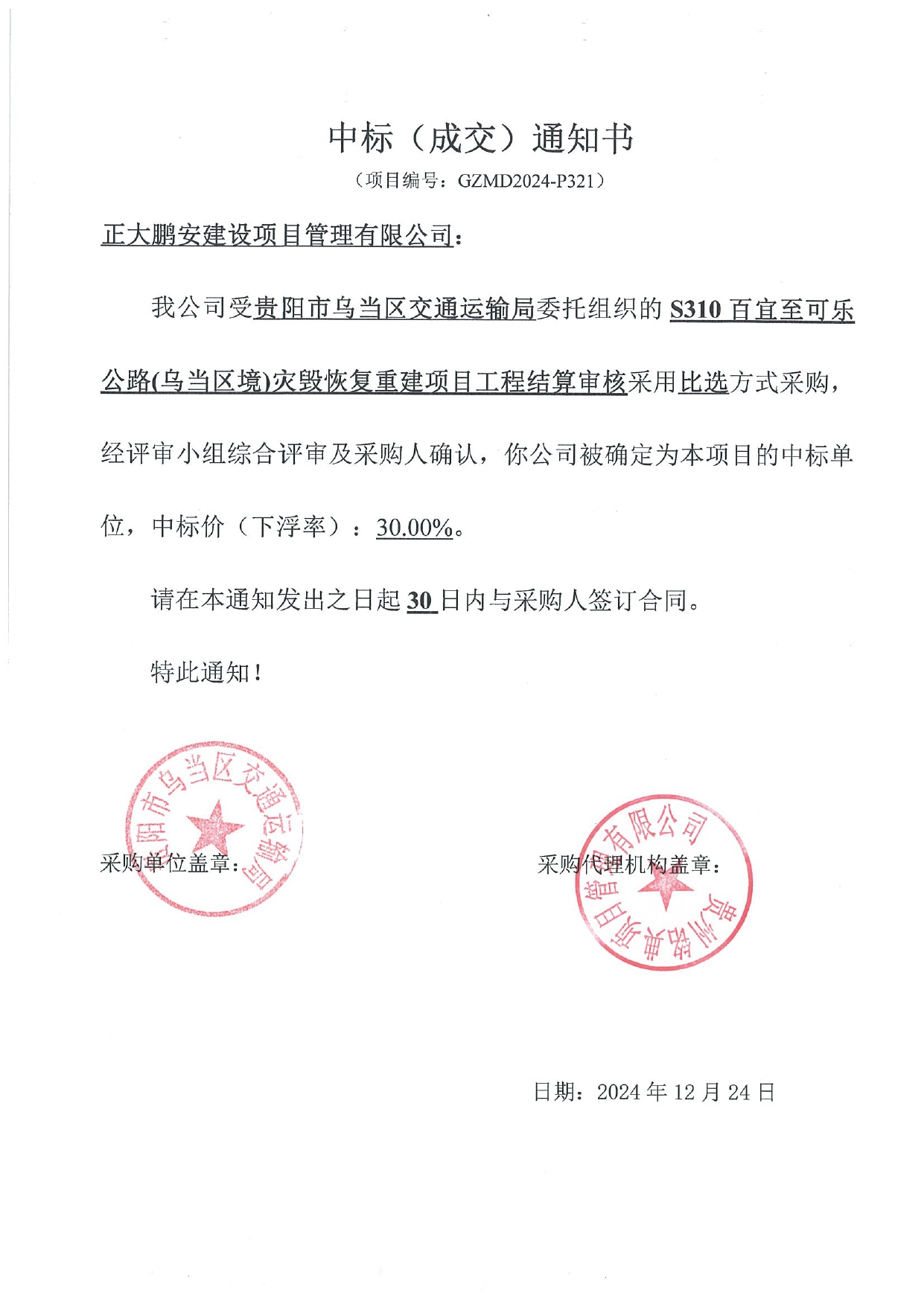 2024年12月24日,經(jīng)評標(biāo)委員會綜合評審,招標(biāo)人確認(rèn),正大鵬安建設(shè)項(xiàng)目管理有限公司中標(biāo)貴州省S310百宜至可樂公路(烏當(dāng)區(qū)境)災(zāi)毀恢復(fù)重建項(xiàng)目工程結(jié)算審核。