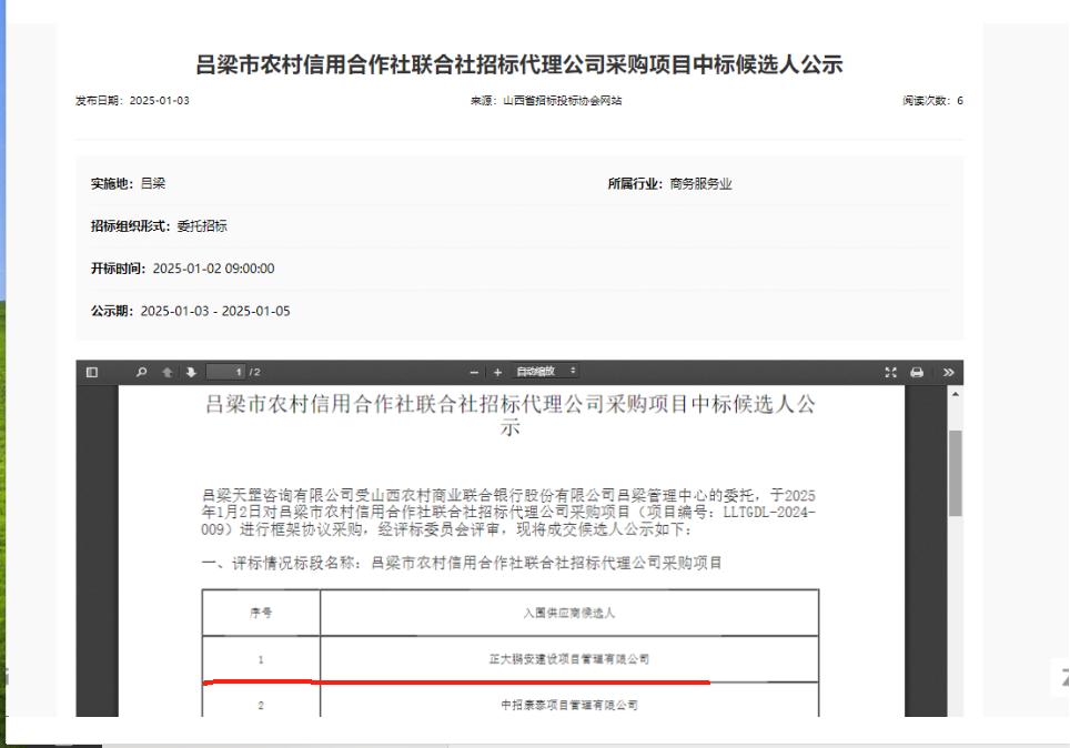 2025年1月2日,經(jīng)評(píng)標(biāo)委員會(huì)綜合評(píng)審,招標(biāo)人確認(rèn),正大鵬安建設(shè)項(xiàng)目管理有限公司入圍呂梁市農(nóng)村信用合作社聯(lián)合社招標(biāo)代理公司采購(gòu)項(xiàng)目。