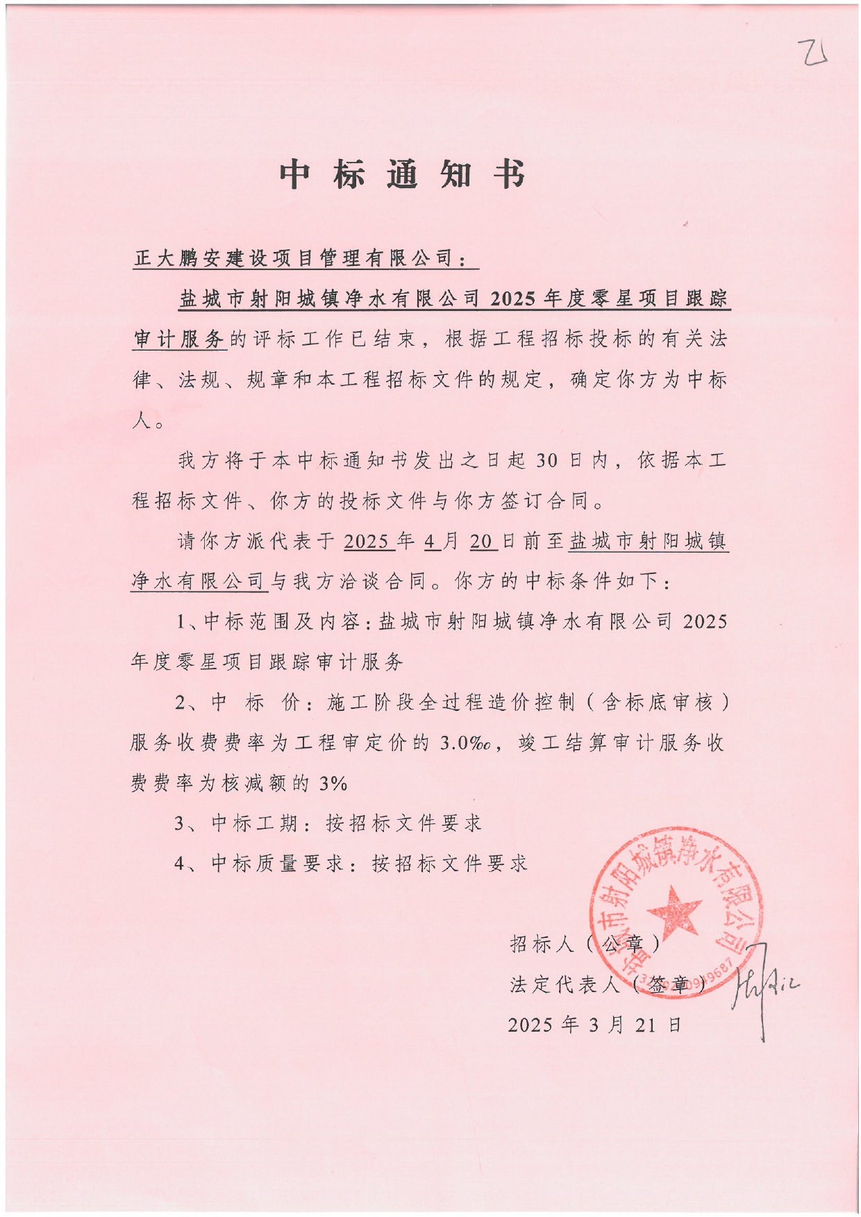 2025年3月17日,經(jīng)評標(biāo)委員會綜合評審,招標(biāo)人確認(rèn),正大鵬安中標(biāo)標(biāo)鹽城市射陽城鎮(zhèn)凈水有限公司2025年度零星項目跟蹤審計服務(wù)。