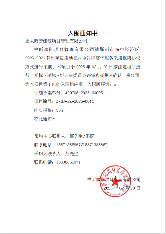 2025年2月20日,經(jīng)評標委員會綜合評審,招標人確認,正大鵬安中標鄂州市臨空經(jīng)濟區(qū)2025-2026建設(shè)項目用地征收全過程咨詢服務(wù)框架協(xié)議。