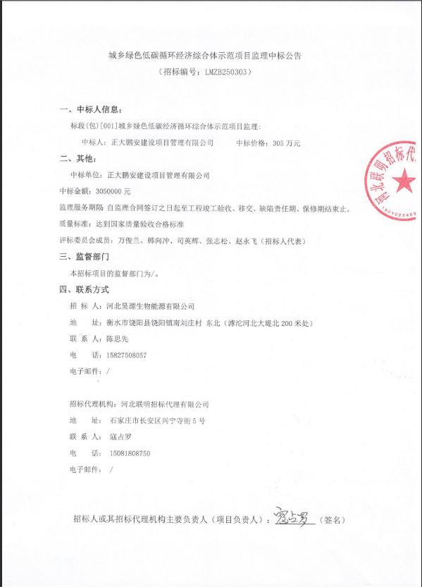 2025年4月10日,經(jīng)評(píng)標(biāo)委員會(huì)綜合評(píng)審,招標(biāo)人確認(rèn),正大鵬安中標(biāo)河北省衡水市城鄉(xiāng)綠色低碳循環(huán)經(jīng)濟(jì)綜合體示范項(xiàng)目監(jiān)理。