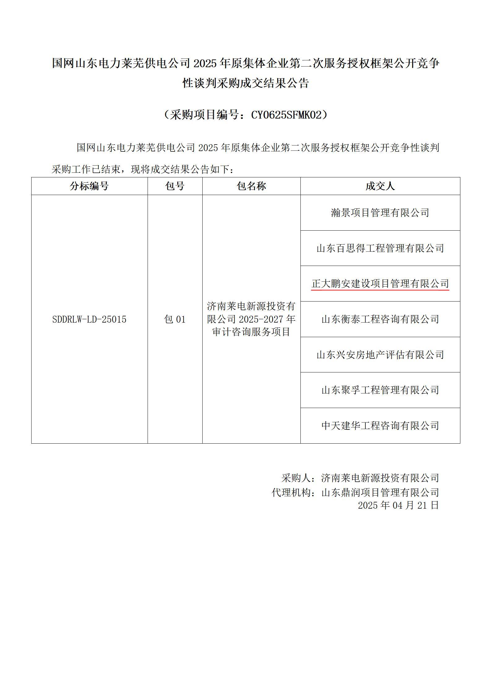 2025年4月21日,經(jīng)評標(biāo)委員會綜合評審,招標(biāo)人確認(rèn),正大鵬安建設(shè)項目管理有限公司中標(biāo)國網(wǎng)山東電力萊蕪供電公司2025年原集體企業(yè)第二次服務(wù)授權(quán)框架公開競爭性談判采購(項目編號:CY0625SFMK02)濟(jì)南萊電新源投資有限公司2025-2027年審計咨詢服務(wù)項目包01。