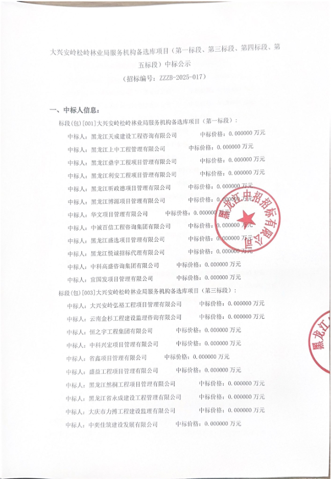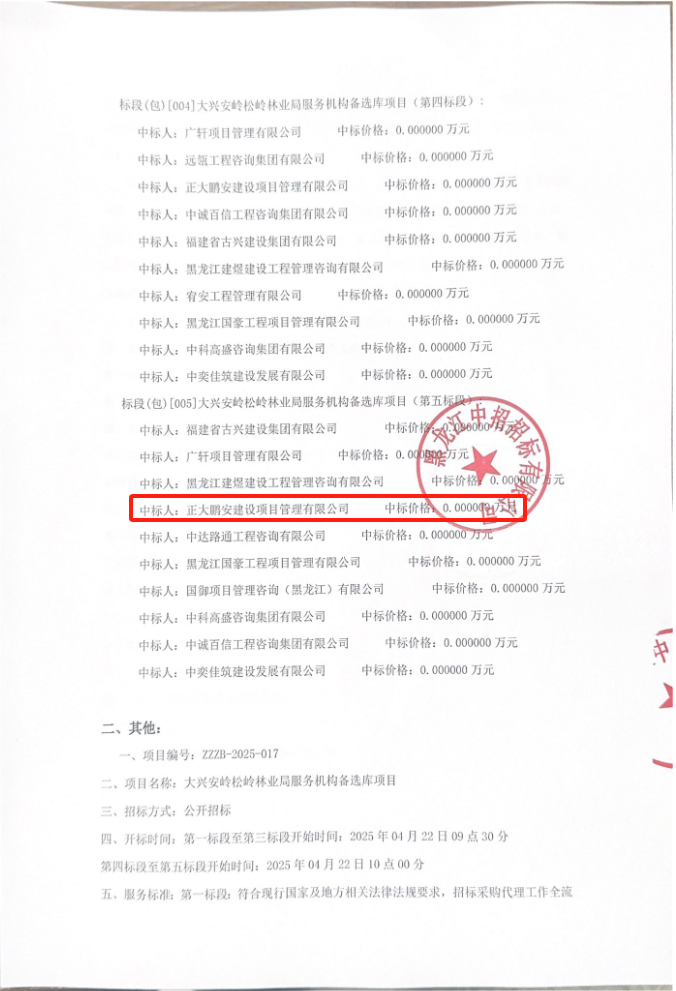 2025年4月23日,經(jīng)評標委員會綜合評審,招標人確認,正大鵬安建設(shè)項目管理有限公司中標大興安嶺松嶺林業(yè)局服務(wù)機構(gòu)備選庫項目(第五標段)。