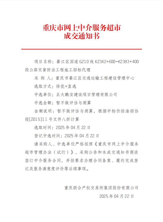 2025年4月22日,經(jīng)評標委員會綜合評審,招標人確認,正大鵬安建設(shè)項目管理有限公司中標綦江區(qū)國道G210線K2342+600-K2383+400段公路災害防治工程施工招標代理項目。
