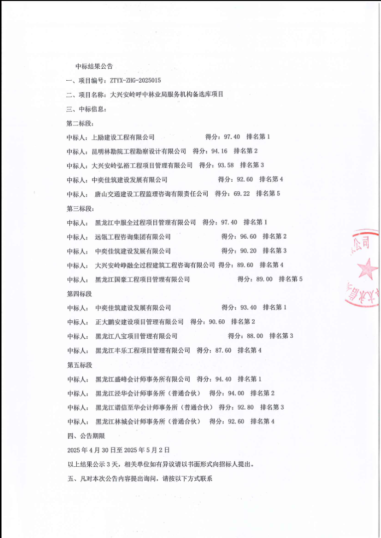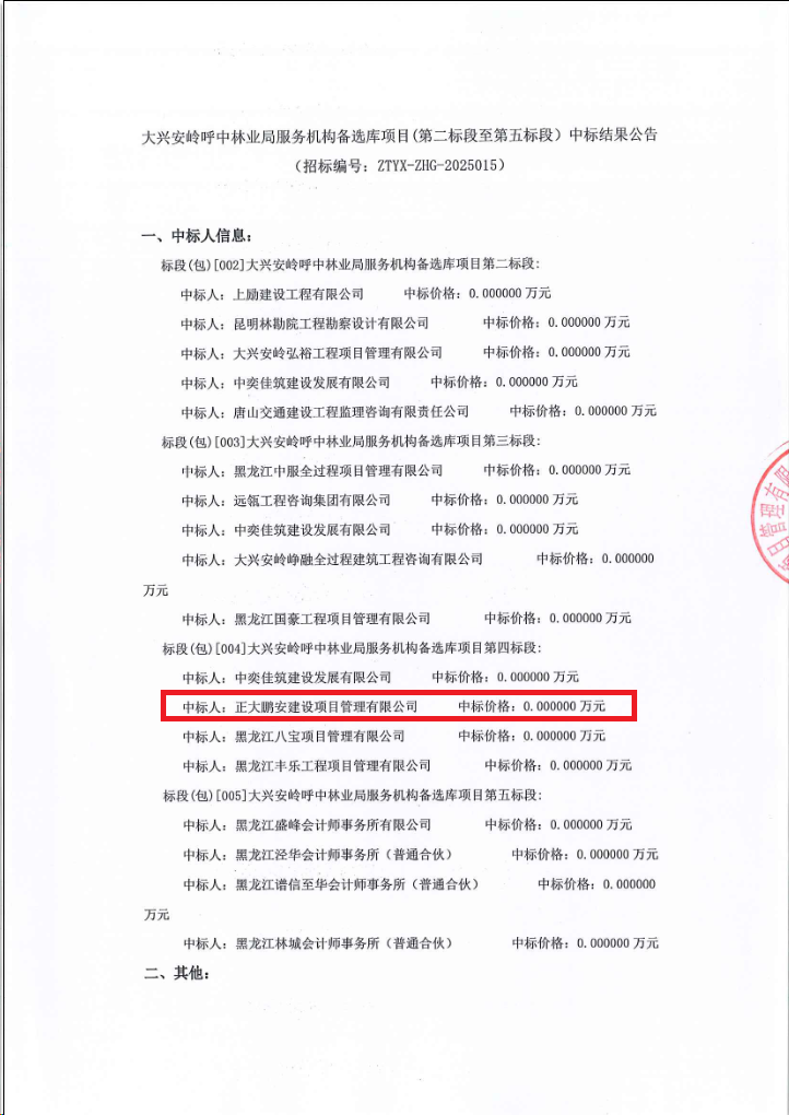 2025年4月30日,經(jīng)評標委員會綜合評審,招標人確認,正大鵬安建設(shè)項目管理有限公司中標大興安嶺呼中林業(yè)局服務(wù)機構(gòu)備選庫項目(第四標段)。