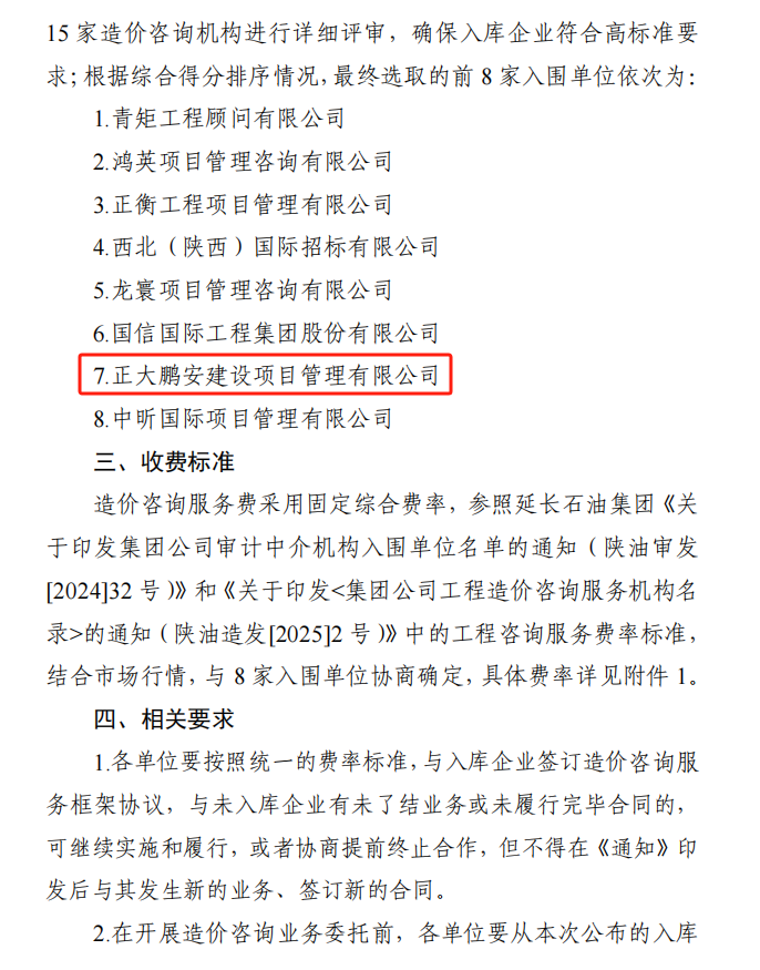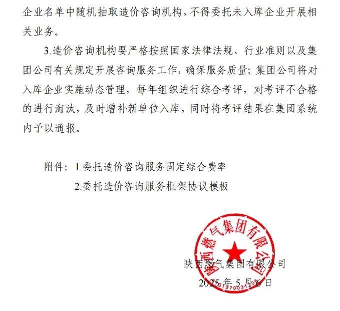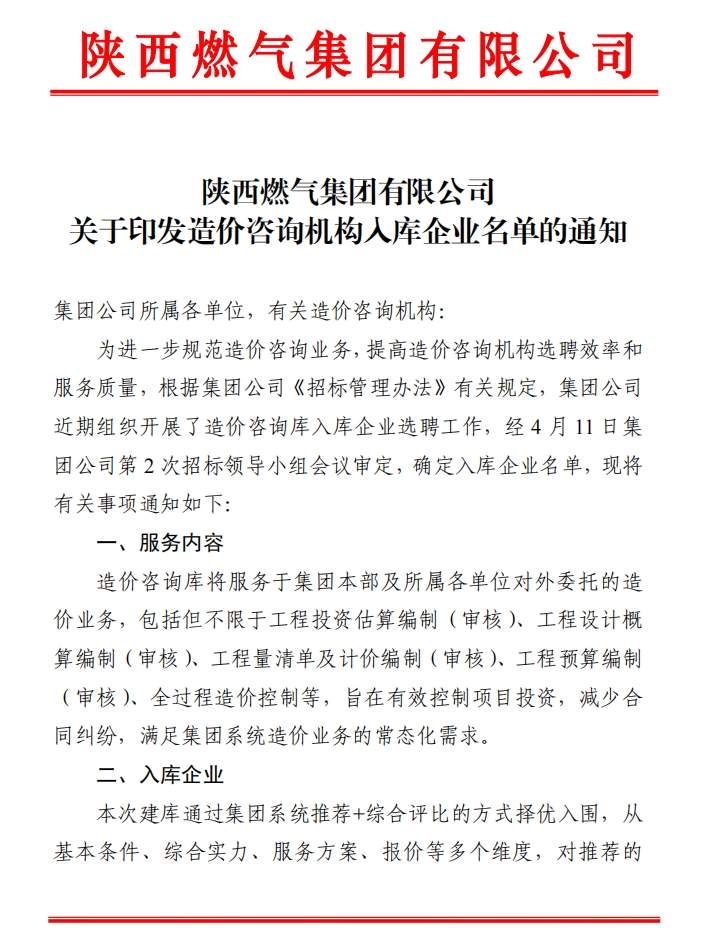 2025年4月11日,經(jīng)評標委員會綜合評審,招標人確認,正大鵬安建設(shè)項目管理有限公司入圍陜西燃氣集團有限公司造價咨詢庫入庫企業(yè)選聘項目。
