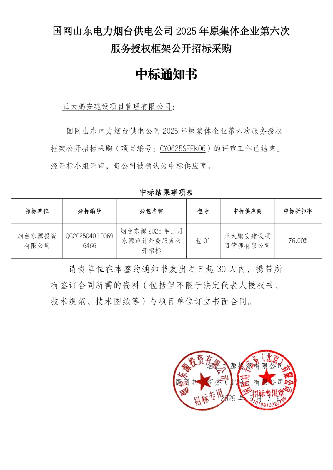 正大鵬安中標(biāo)國網(wǎng)山東電力煙臺(tái)供電公司2025年原集體企業(yè)第六次服務(wù)授權(quán)框架公開招標(biāo)采購