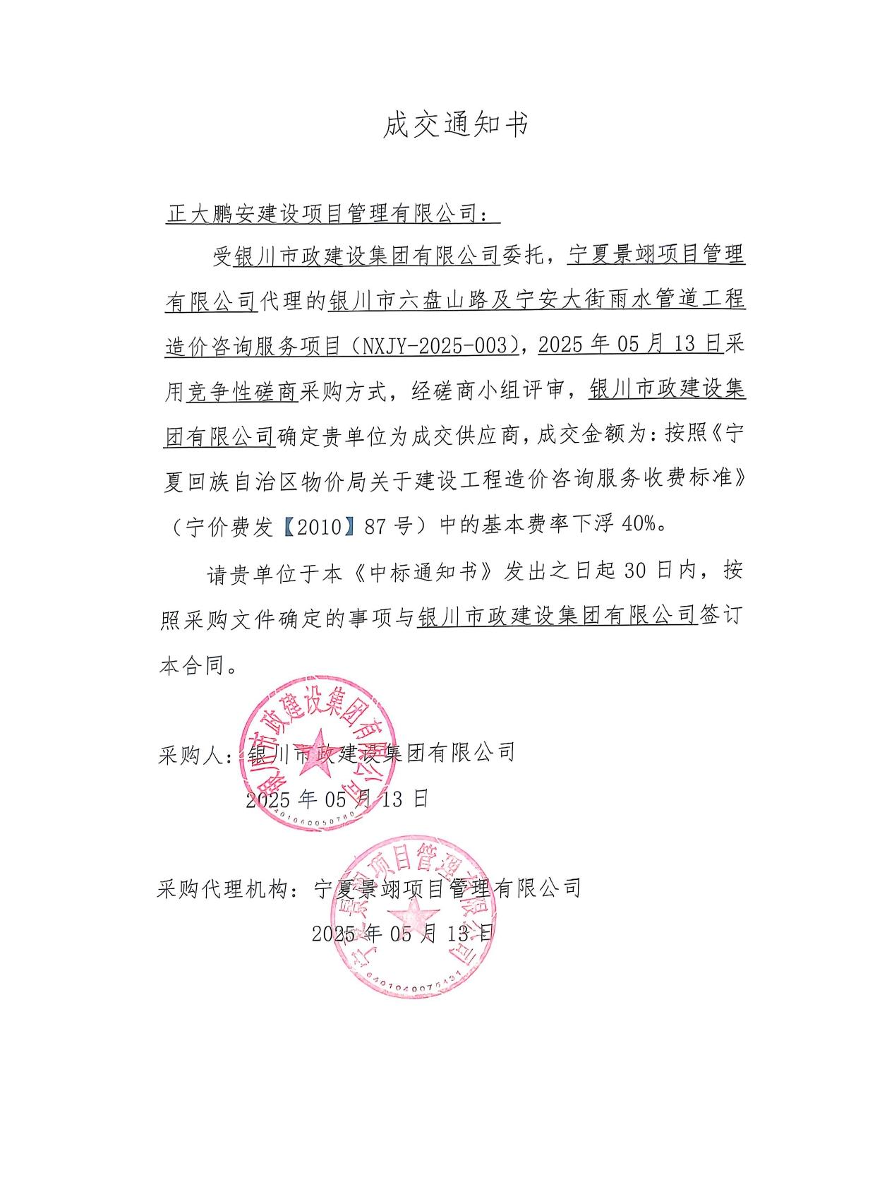 正大鵬安中標(biāo)銀川市六盤山路及寧安大街雨水管道工程造價(jià)咨詢服務(wù)項(xiàng)目