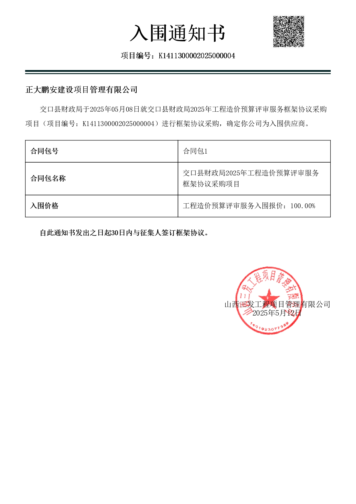 2025年5月12日,經(jīng)評標委員會綜合評審,招標人確認,正大鵬安建設項目管理有限公司入圍山西省交口縣財政局2025年工程造價預算評審服務框架協(xié)議采購項目。
