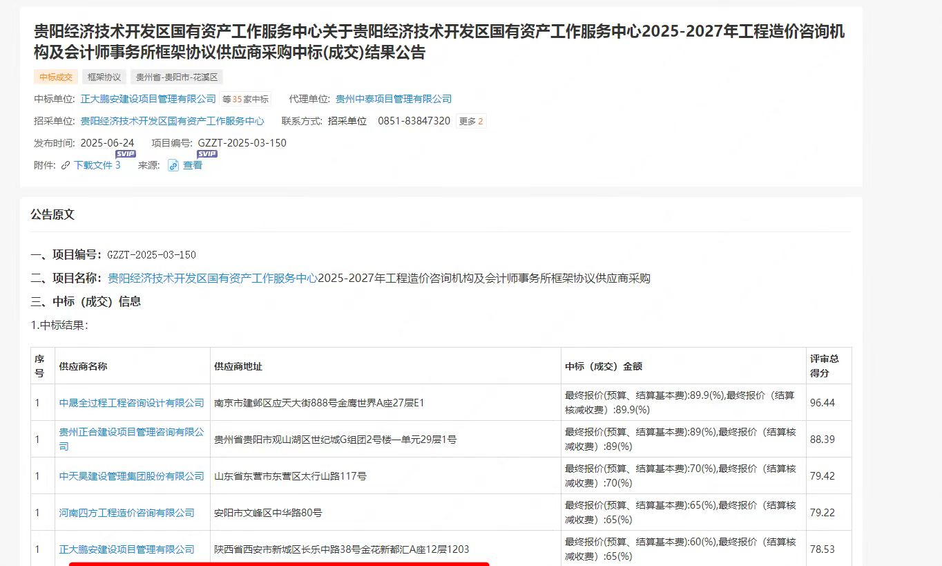 正大鵬安中標(biāo)貴州省貴陽經(jīng)濟(jì)技術(shù)開發(fā)區(qū)國有資產(chǎn)工作服務(wù)中心2025-2027年工程造價(jià)咨詢機(jī)構(gòu)供應(yīng)商采購項(xiàng)目
