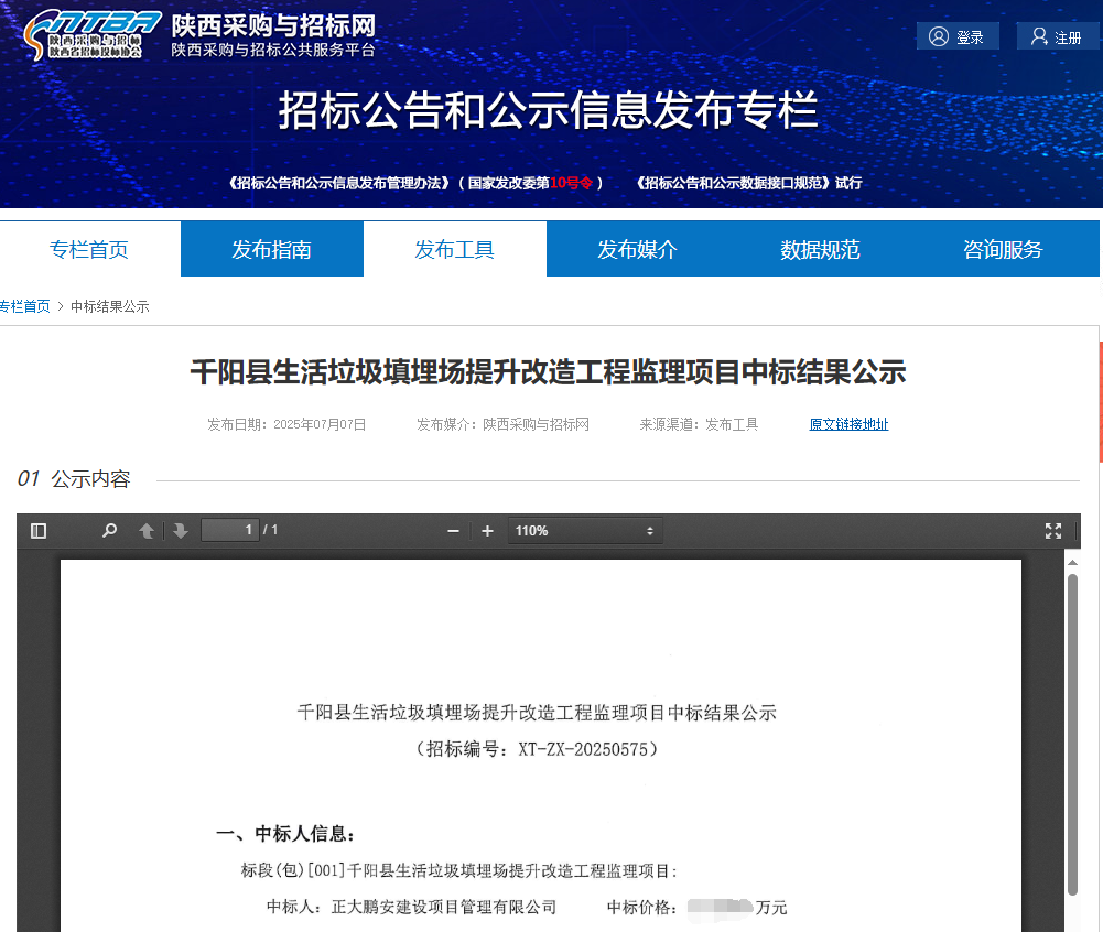 2025年7月7日,經(jīng)評標(biāo)委員會綜合評審,招標(biāo)人確認(rèn),正大鵬安中標(biāo)陜西省寶雞市千陽縣生活垃圾填埋場提升改造工程監(jiān)理項目。
