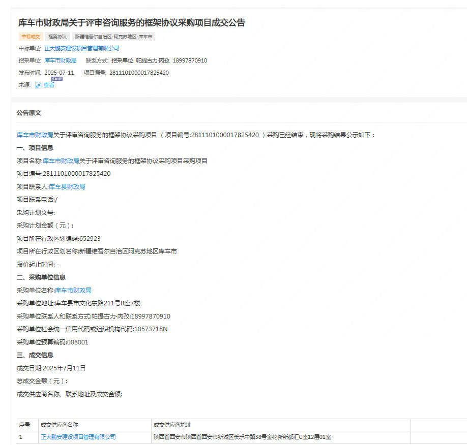 2025年7月11日,經(jīng)評(píng)標(biāo)委員會(huì)綜合評(píng)審,招標(biāo)人確認(rèn),正大鵬安建設(shè)項(xiàng)目管理有限公司中標(biāo)新疆庫(kù)車市財(cái)政局關(guān)于評(píng)審咨詢服務(wù)的框架協(xié)議采購(gòu)項(xiàng)目。