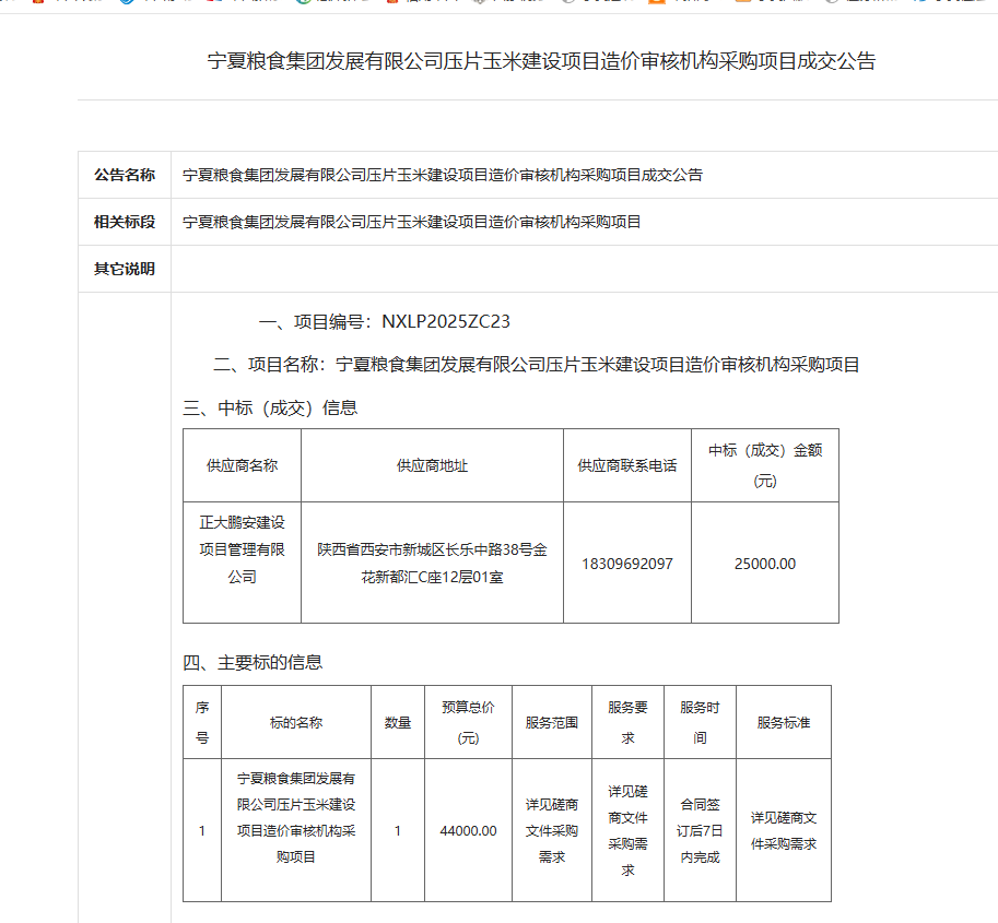 2025年7月18日,經(jīng)評(píng)標(biāo)委員會(huì)綜合評(píng)審,招標(biāo)人確認(rèn),正大鵬安建設(shè)項(xiàng)目管理有限公司中標(biāo)寧夏糧食集團(tuán)發(fā)展有限公司壓片玉米建設(shè)項(xiàng)目造價(jià)審核機(jī)構(gòu)采購(gòu)項(xiàng)目。