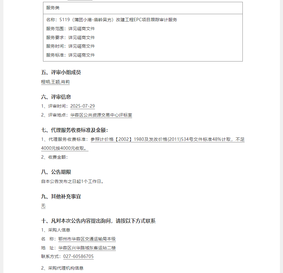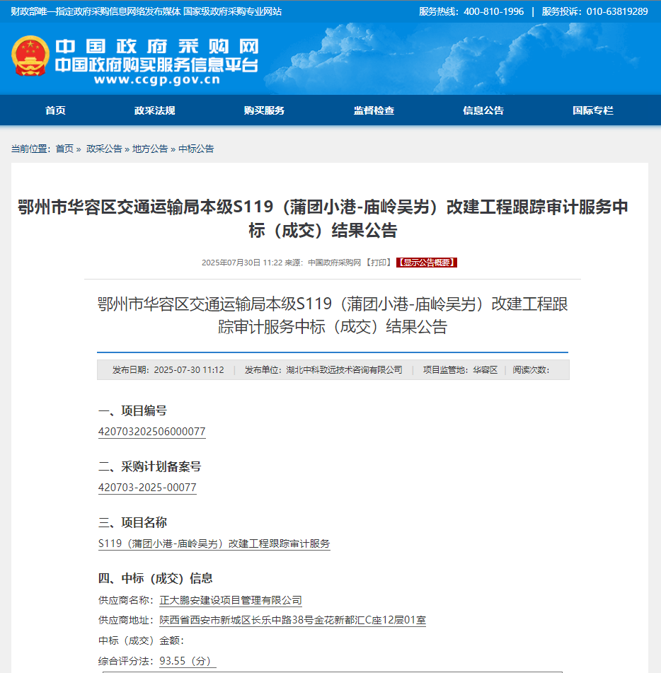 2025年7月30日,經(jīng)評標(biāo)委員會(huì)綜合評審,招標(biāo)人確認(rèn),正大鵬安建設(shè)項(xiàng)目管理有限公司中標(biāo)鄂州市華容區(qū)交通運(yùn)輸局本級(jí)S119(蒲團(tuán)小港-廟嶺吳屴)改建工程跟蹤審計(jì)服務(wù)。