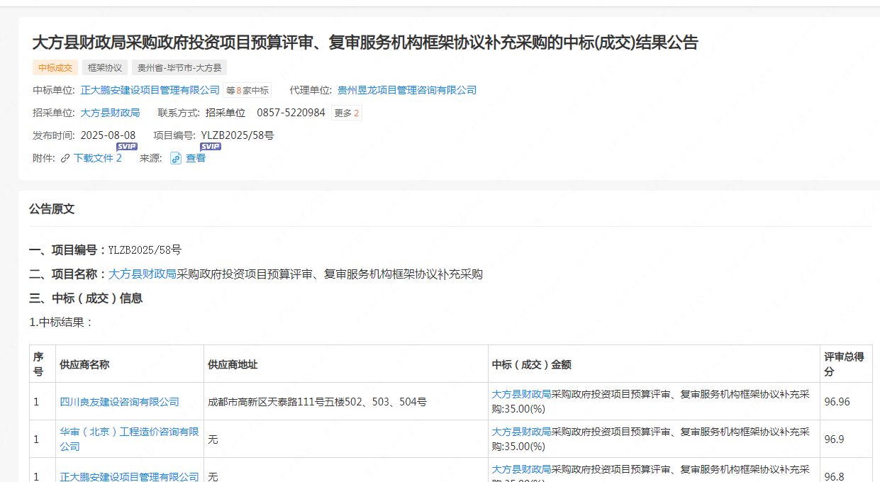 2025年8月8日,經(jīng)評(píng)標(biāo)委員會(huì)綜合評(píng)審,招標(biāo)人確認(rèn),正大鵬安建設(shè)項(xiàng)目管理有限公司中標(biāo)貴州省大方縣財(cái)政局采購(gòu)政府投資項(xiàng)目預(yù)算評(píng)審、復(fù)審服務(wù)機(jī)構(gòu)框架協(xié)議補(bǔ)充采購(gòu)項(xiàng)目。