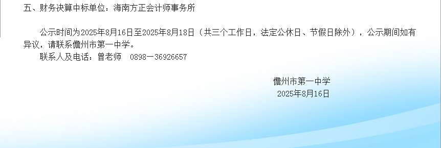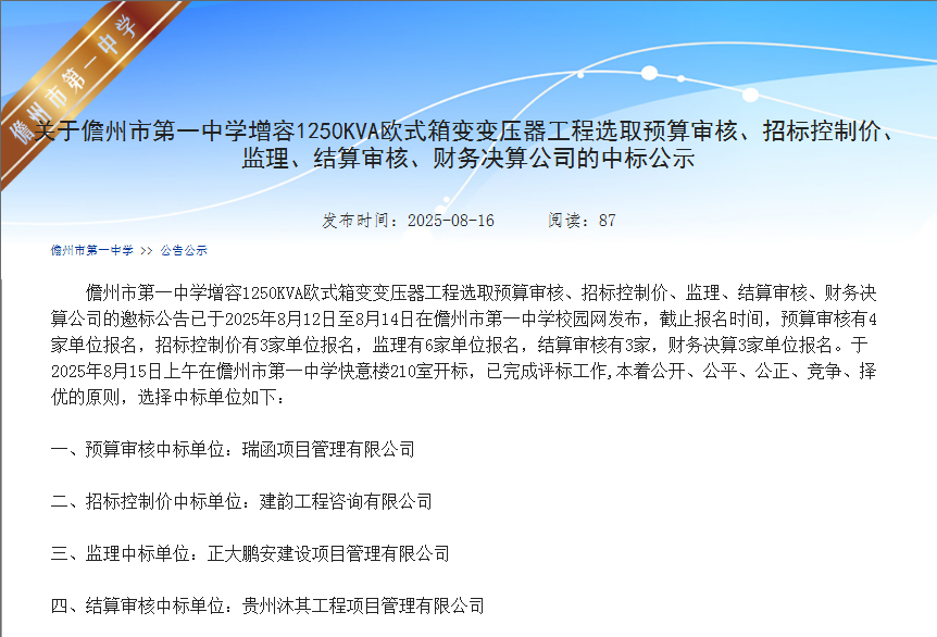 2025年8月16日,經(jīng)評標(biāo)委員會綜合評審,招標(biāo)人確認(rèn),正大鵬安中標(biāo)儋州市第一中學(xué)增容1250KVA歐式箱變變壓器工程-監(jiān)理。
