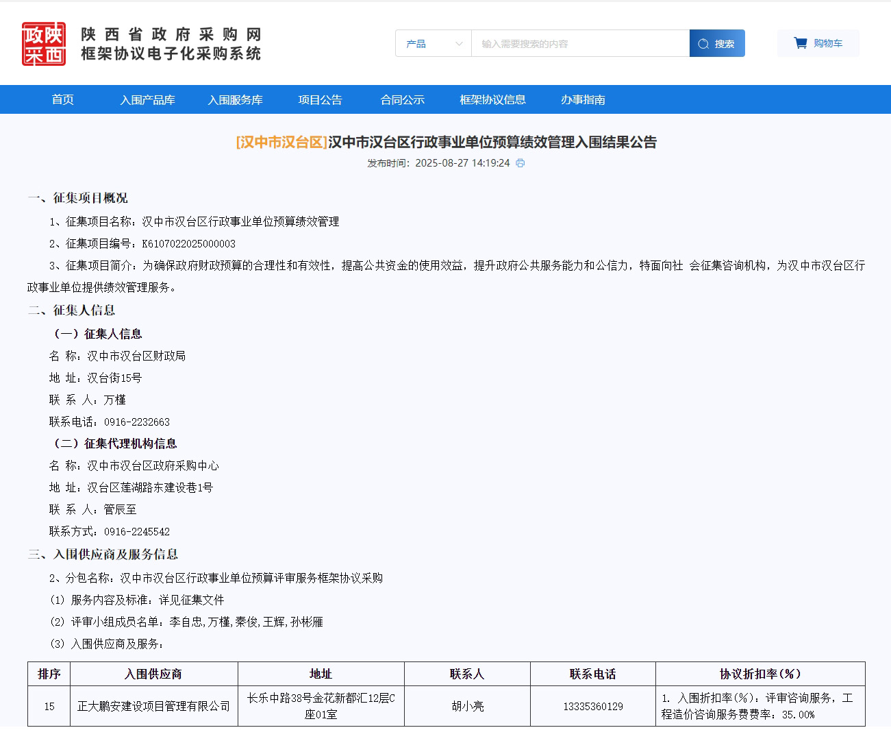 2025年8月28日,經(jīng)評(píng)標(biāo)委員會(huì)綜合評(píng)審,招標(biāo)人確認(rèn),正大鵬安建設(shè)項(xiàng)目管理有限公司入圍漢中市漢臺(tái)區(qū)行政事業(yè)單位預(yù)算績(jī)效管理項(xiàng)目。