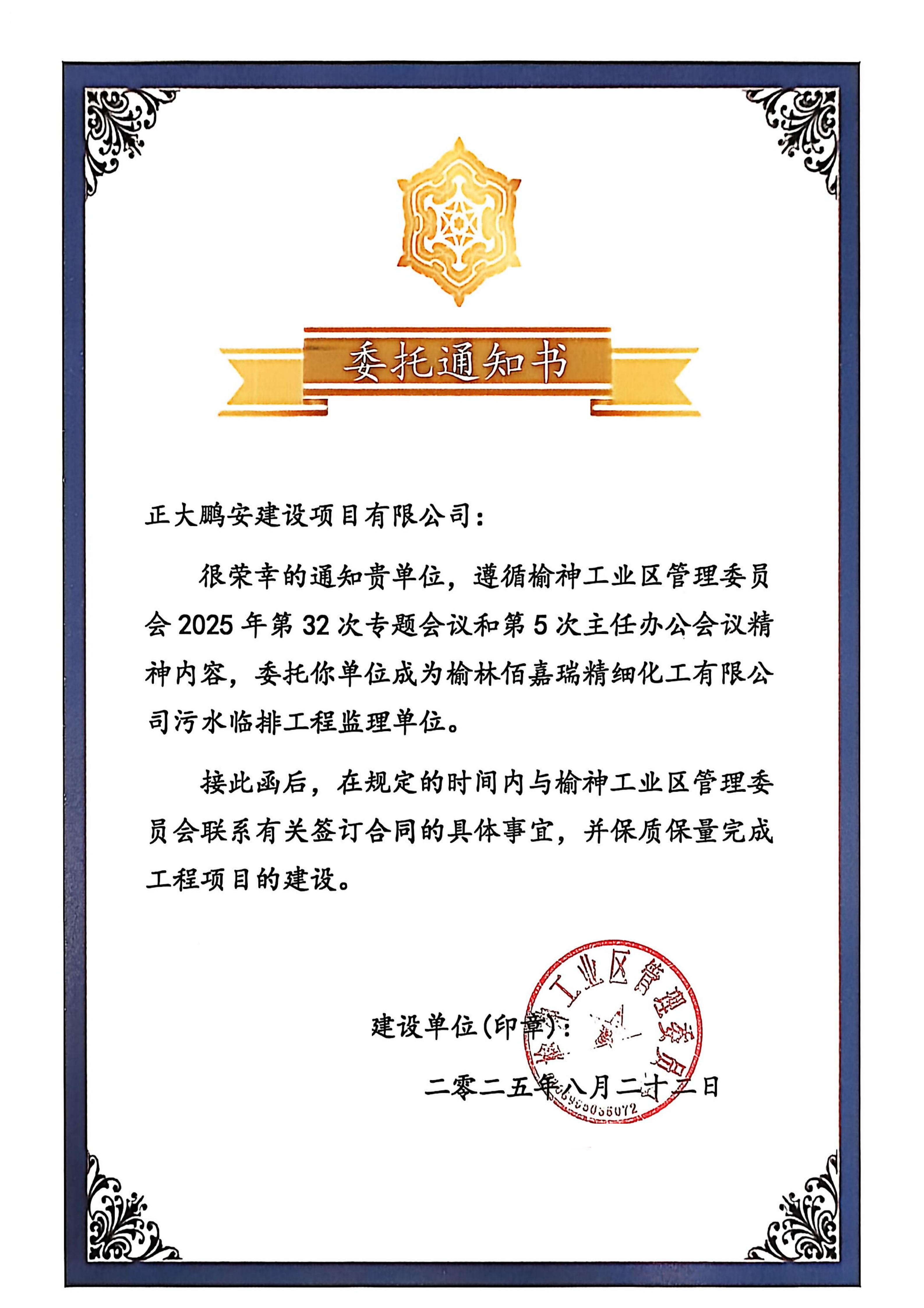 2025年8月22日,經(jīng)榆神工業(yè)區(qū)管理委員會確認,正大鵬安中標(biāo)陜西省榆林市榆林佰嘉瑞精細化工有限公司污水臨排工程監(jiān)理。